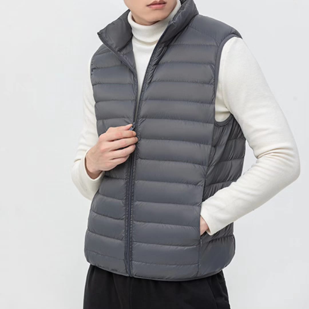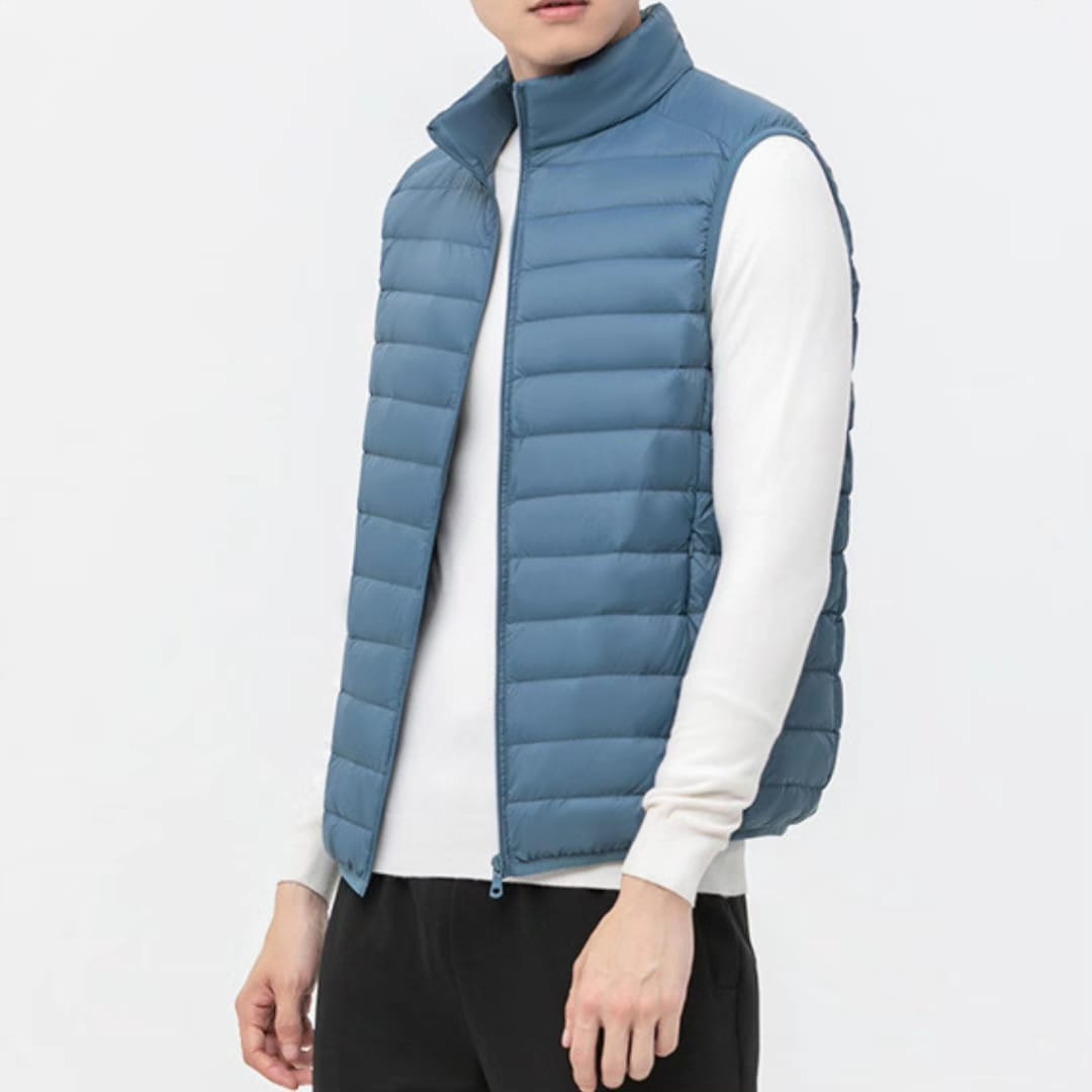 A lightweight and warm duck down vest with a stand collarperfect for layering during chilly spring, autumn, or mild winter days.