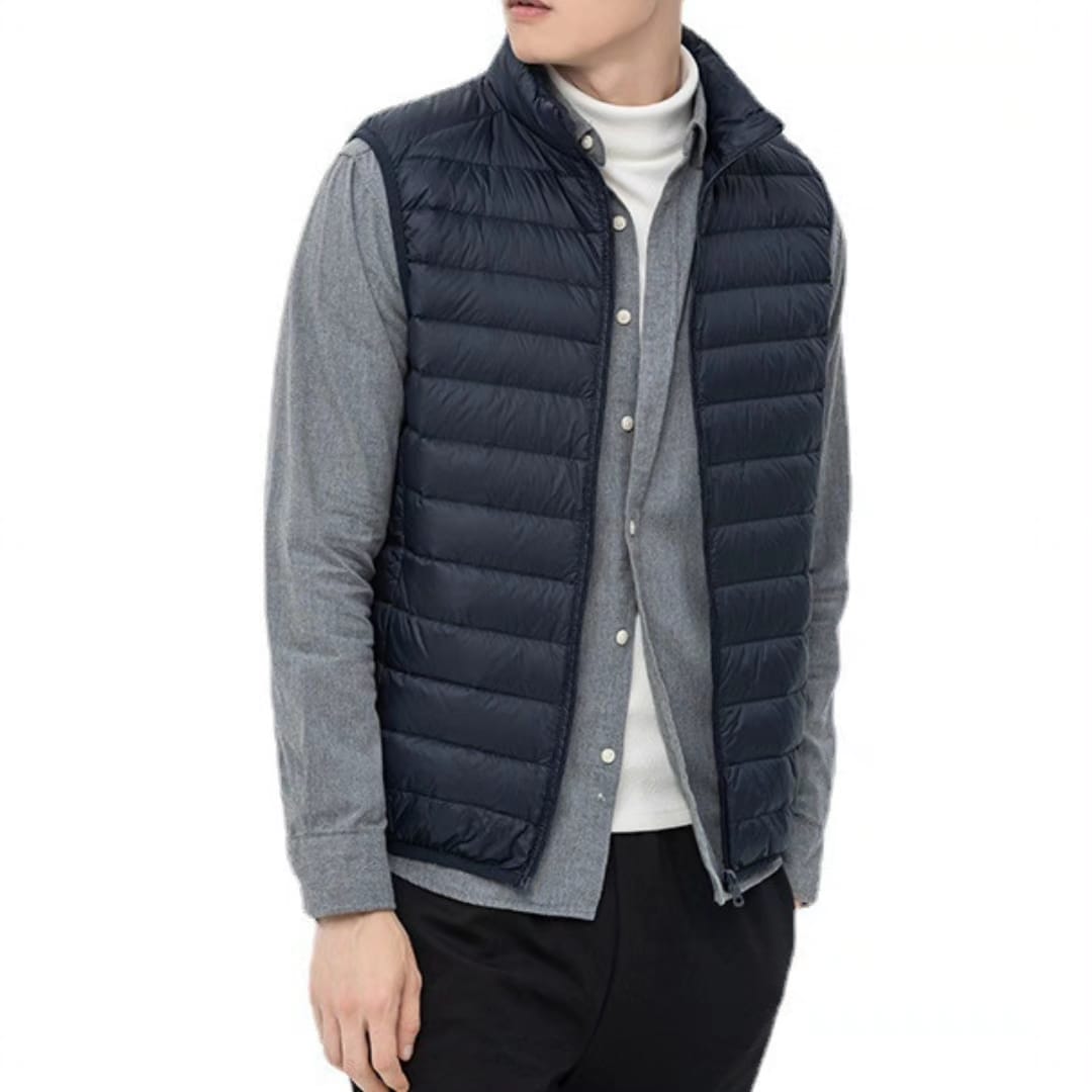 Stay warm without the bulk in this mens lightweight duck down stand collar vestdesigned for comfort, mobility, and seasonal versatility. Filled with high-quality duck down, it provides excellent insulation while remaining breathable and feather-light. The stand collar adds extra protection against cool breezes, and the sleek, sleeveless design makes it ideal for layering over hoodies, shirts, or thermals. Whether youre traveling, commuting, or enjoying the outdoors, this vest delivers dependable warmth with a modern look. With its packable design and zippered closure, its the perfect grab-and-go piece for transitional weather.