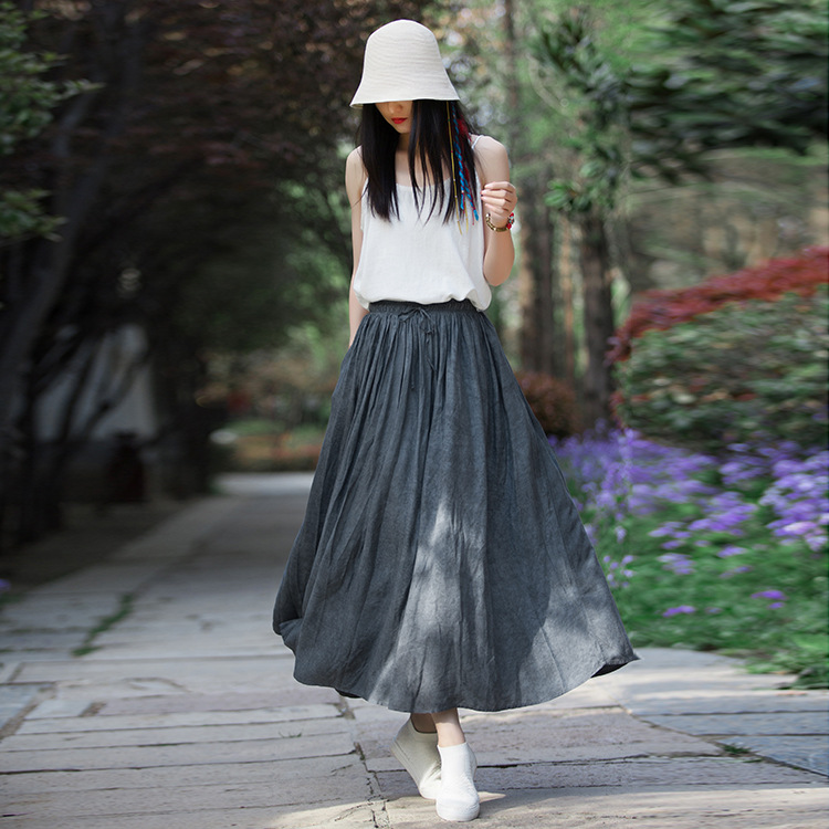Linen Blend Flared Elastic Waist Long Skirt
