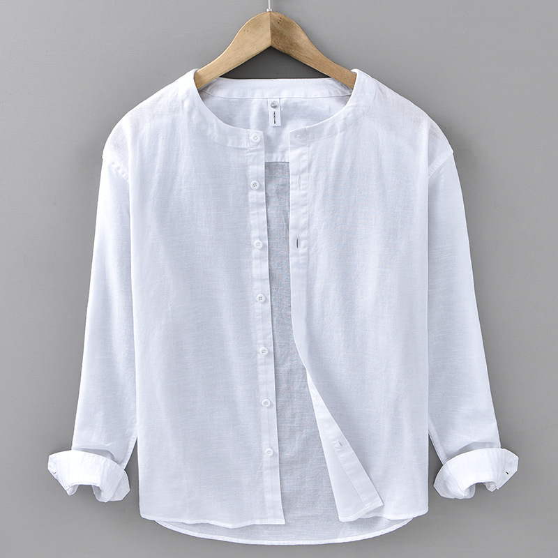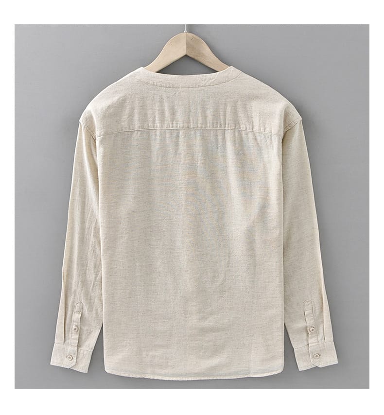 Long Sleeve Cotton Linen Blend Mao Collar Men’s Shirt