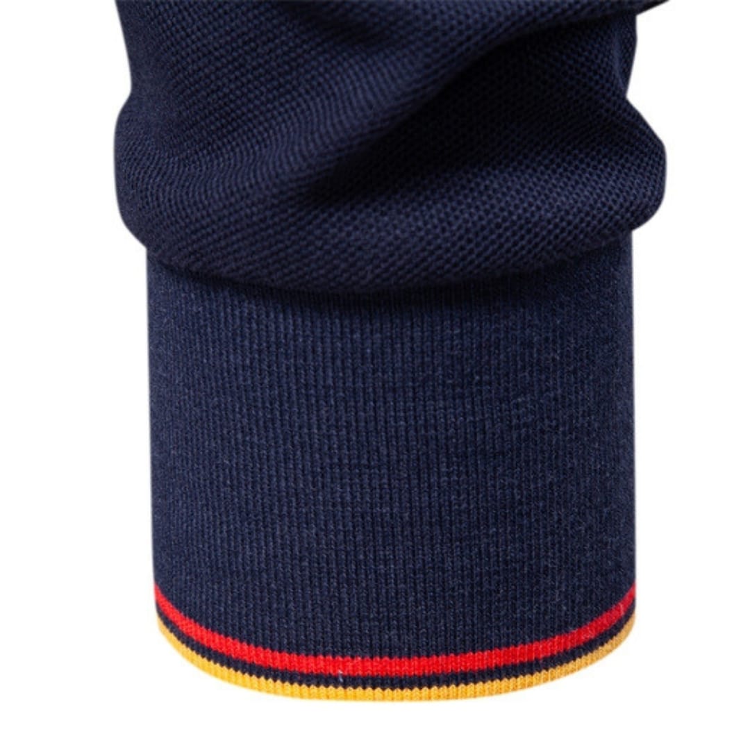 A versatile men’s long sleeve polo with striped edge detailing, perfect for spring, autumn, and winter, offering comfort, style, and a classic casual look.