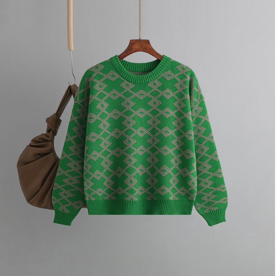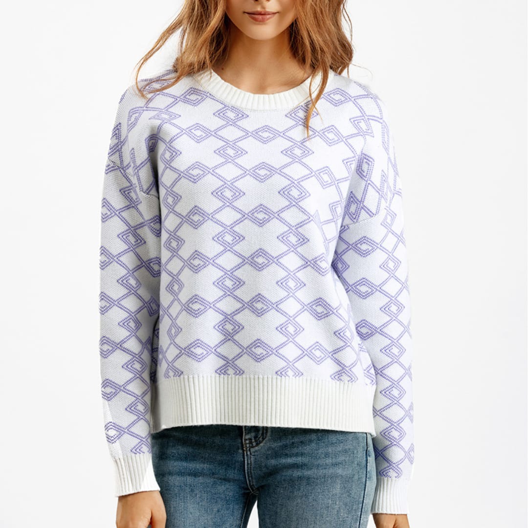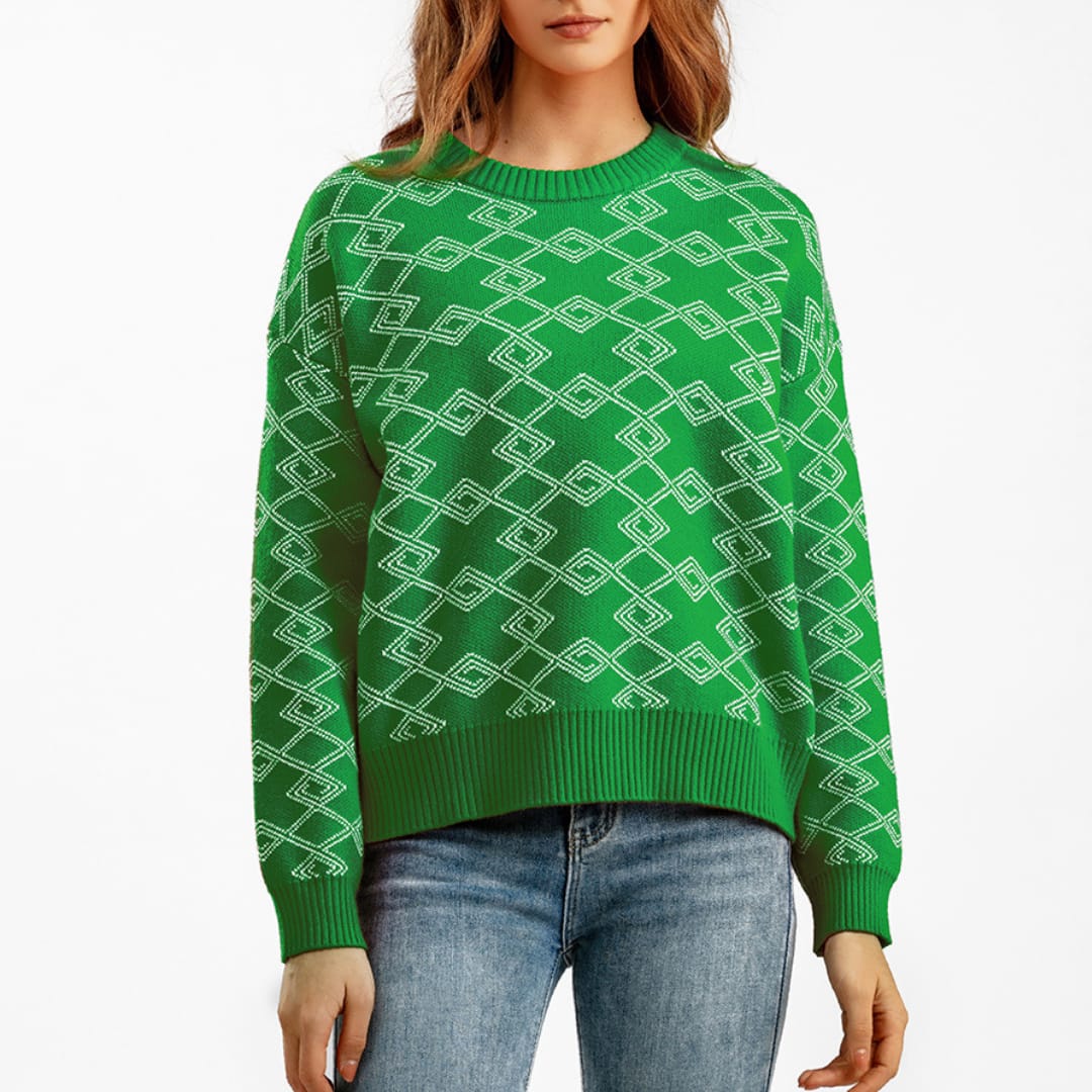 The Long Sleeve Round Neck Loose Fit Aztec Pattern Knitted Sweater brings boho flair to your autumn and winter wardrobe. Crafted from soft, breathable knit fabric, it features intricate Aztec-inspired patterns that add color and texture to your outfit. The loose fit allows for easy layering, while the round neckline and long sleeves ensure warmth and comfort on colder days. Whether you’re heading to a casual outing or cozying up indoors, this sweater pairs effortlessly with jeans, skirts, or leggings for a laid-back yet eye-catching look.Make a statement with this cozy Aztec-patterned sweaterfeaturing a relaxed fit, round neck, and bold seasonal style.