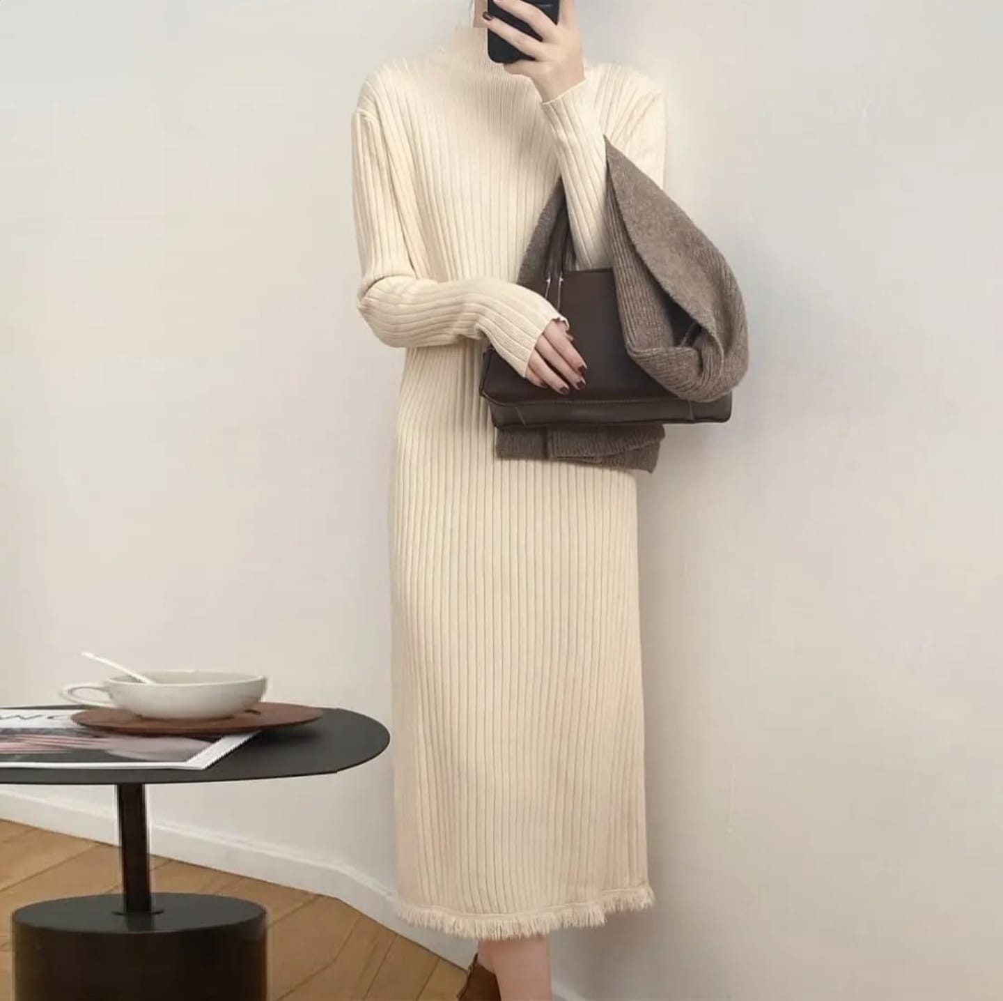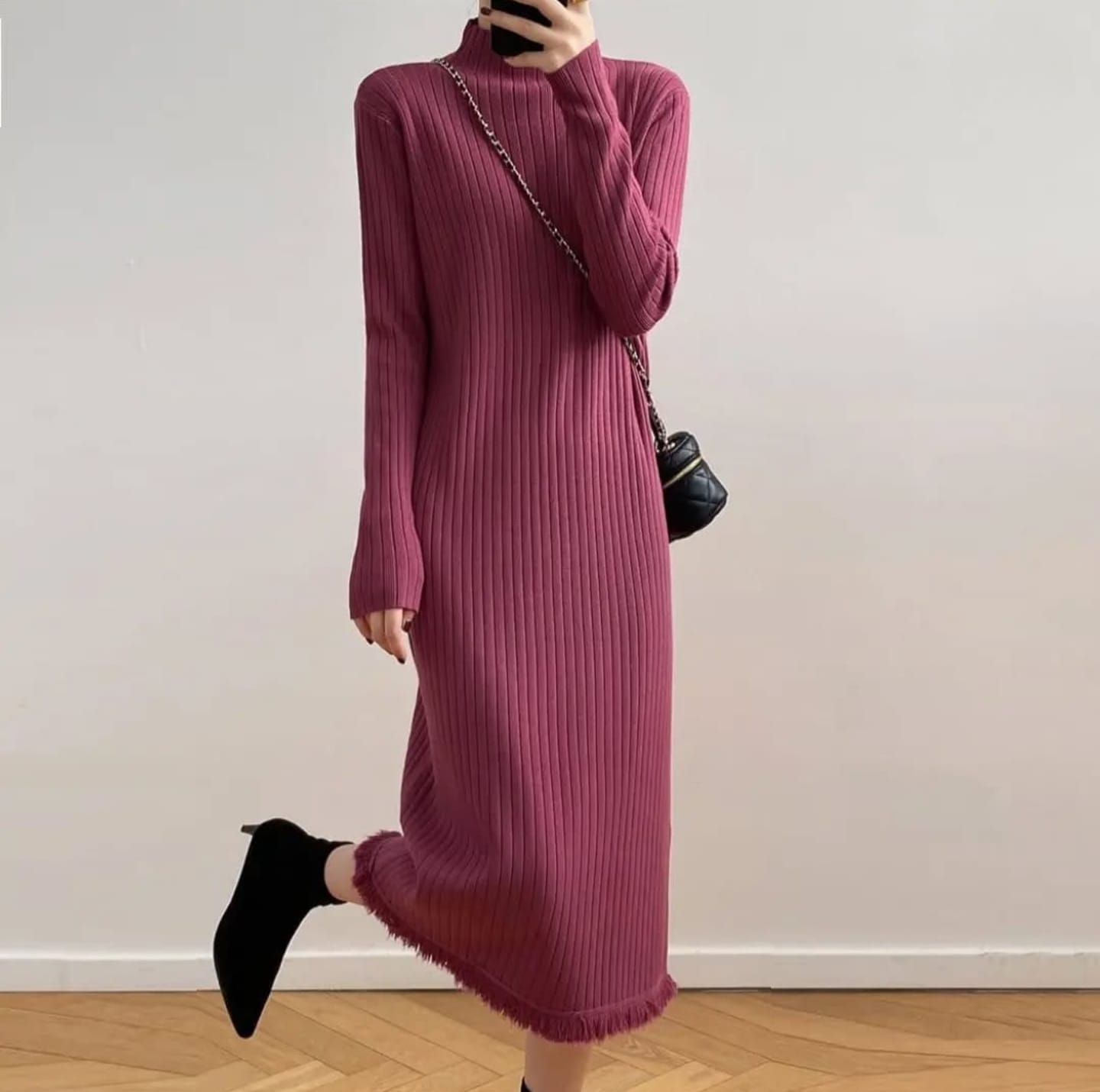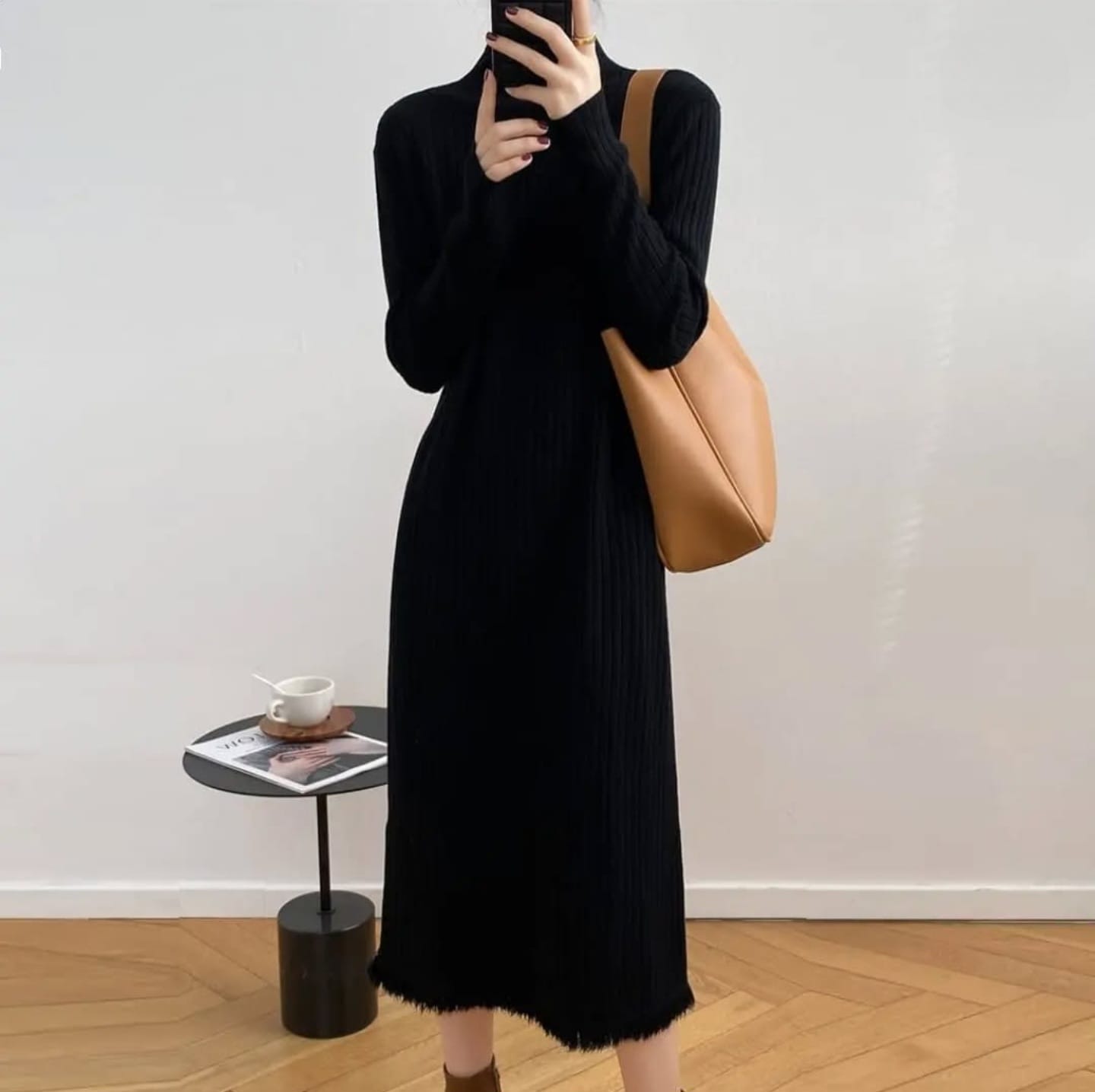 Stay warm and stylish this season with our Winter High Collar Long Sleeve Midi Dress, featuring a cozy thick knit and elegant ruffled hem for chic seasonal fashion.