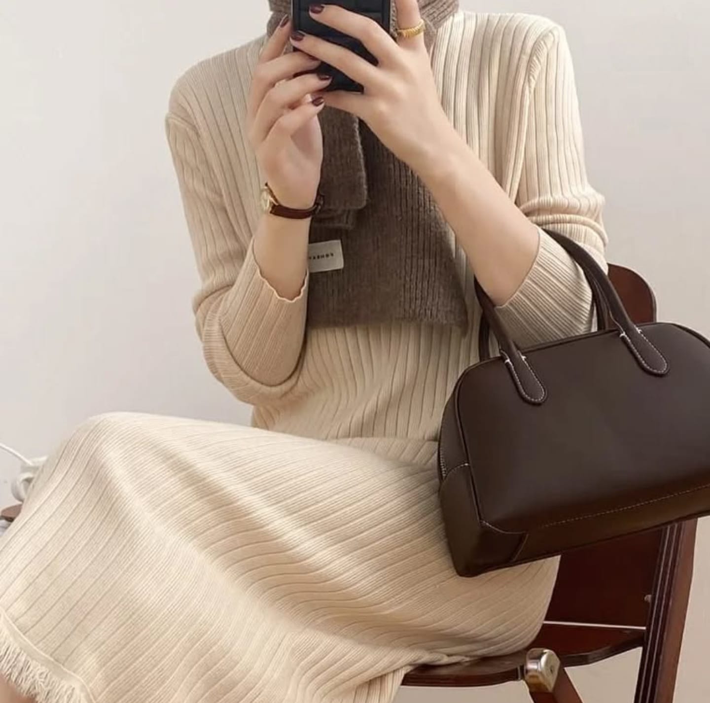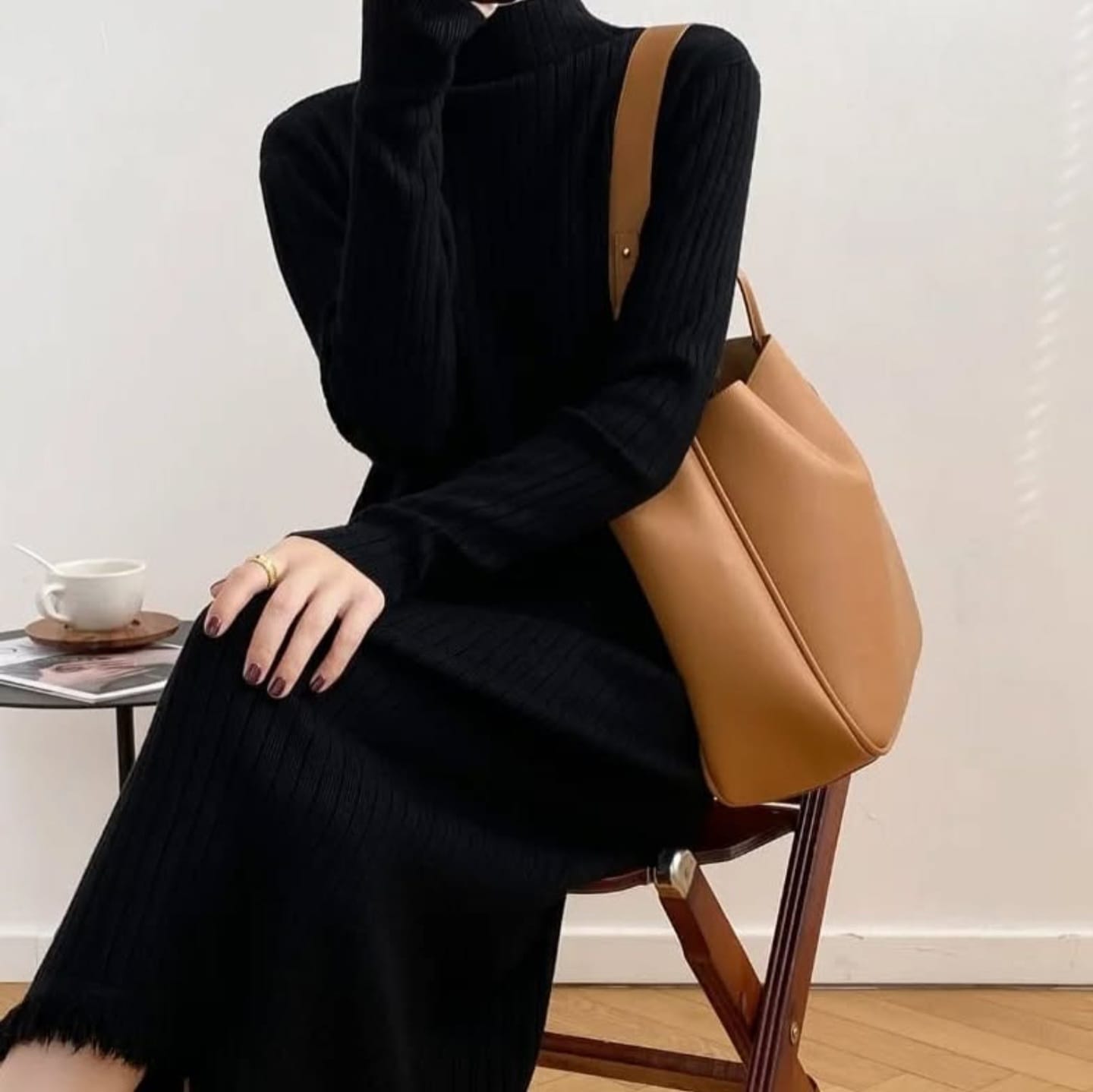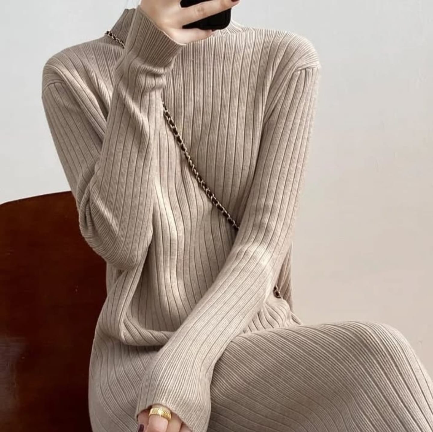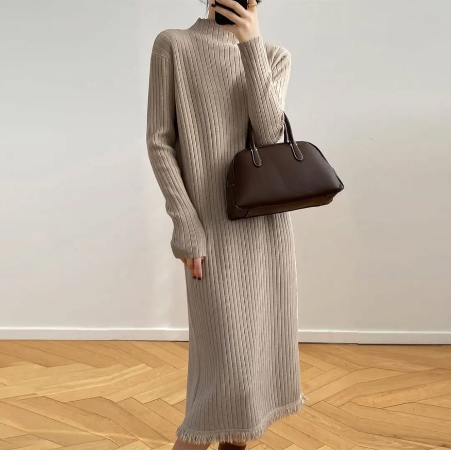 Stay warm and stylish this season with our Winter High Collar Long Sleeve Midi Dress, featuring a cozy thick knit and elegant ruffled hem for chic seasonal fashion.