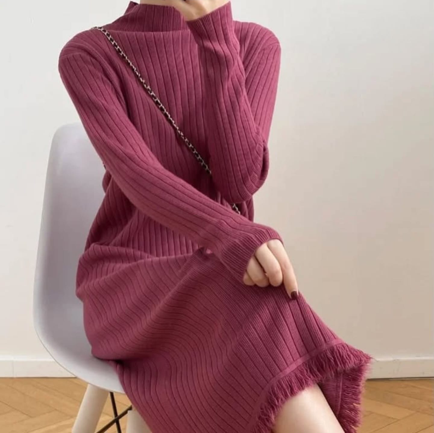 Elevate your winter wardrobe with our High Collar Long Sleeve Ruffled Hem Thick Midi Dress. Crafted from premium thick knit fabric, this dress provides warmth, comfort, and a flattering silhouette for cold-weather days. The high collar adds cozy coverage, while the long sleeves and midi length ensure elegant, practical styling. The ruffled hem introduces a feminine and playful touch, making it perfect for casual outings, office wear, or seasonal gatherings. Lightweight yet insulating, this dress pairs beautifully with boots, tights, or layered outerwear, offering versatile styling options. A must-have statement piece for chic winter fashion.