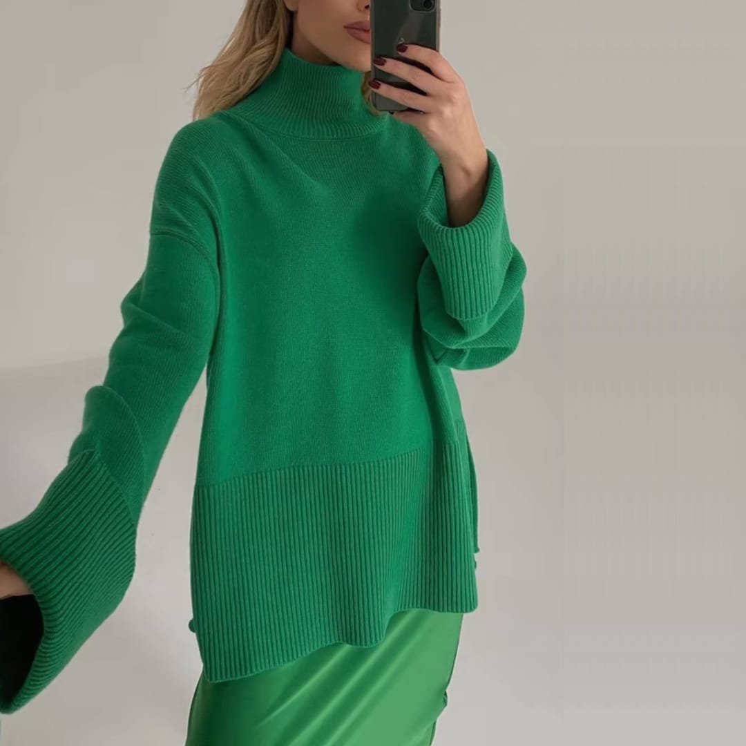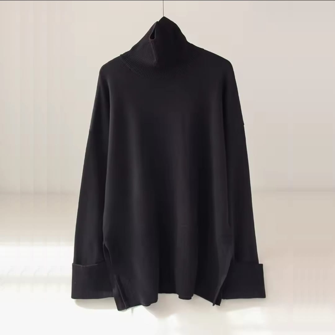 Stylish long sweater with oversized sleeves and side slits for a modern, relaxed look.