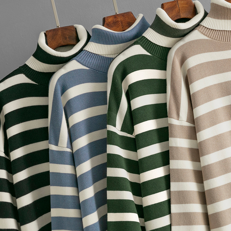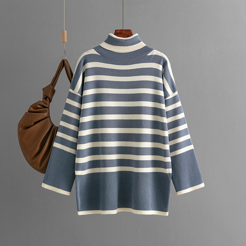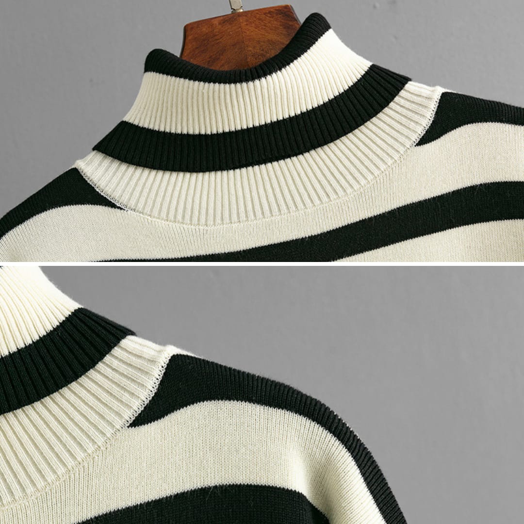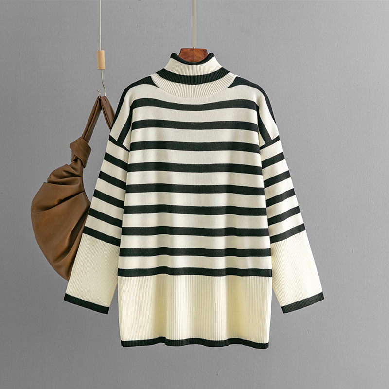 Stay warm and effortlessly chic with this loose fit striped turtleneck sweater. Crafted from soft, breathable knit fabric, it offers a relaxed silhouette that drapes beautifully for all-day comfort. The classic turtleneck provides extra warmth, while the timeless stripe pattern adds a touch of sophistication to your casual wardrobe. Ideal for layering or wearing on its own, this sweater pairs perfectly with jeans, leggings, or skirts for a versatile, stylish look.