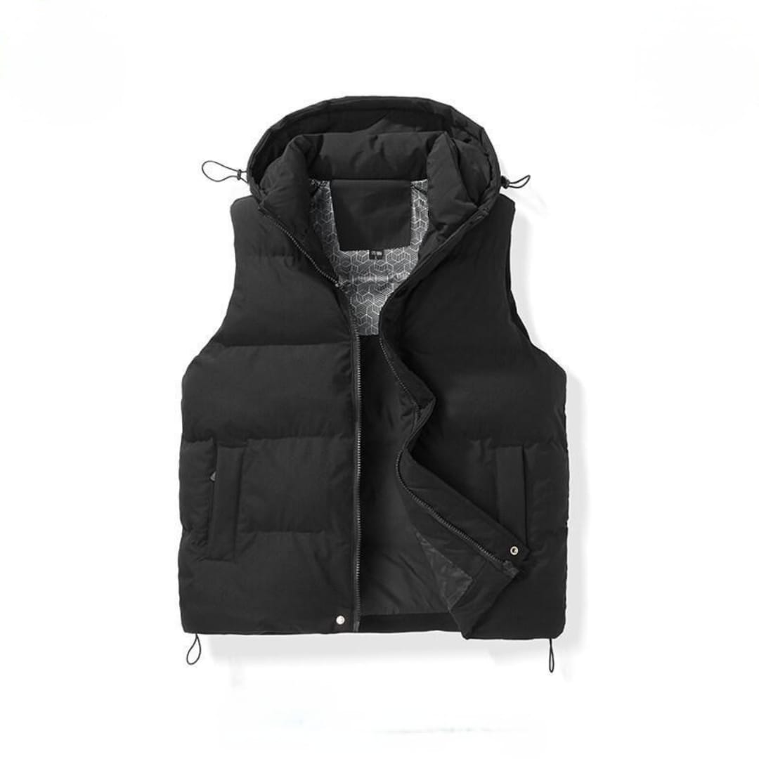 Stay warm and stylish with this hooded, cotton-filled thermal vestperfect for chilly weather layering.