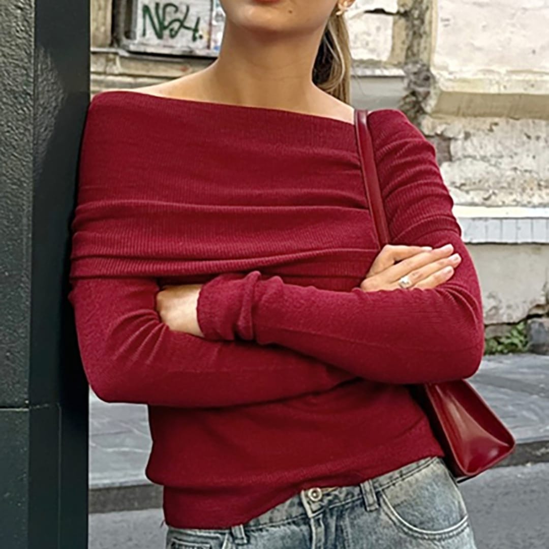 Chic off-shoulder ribbed sweater with a flattering fit and cozy feel.