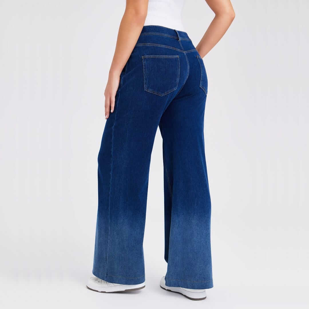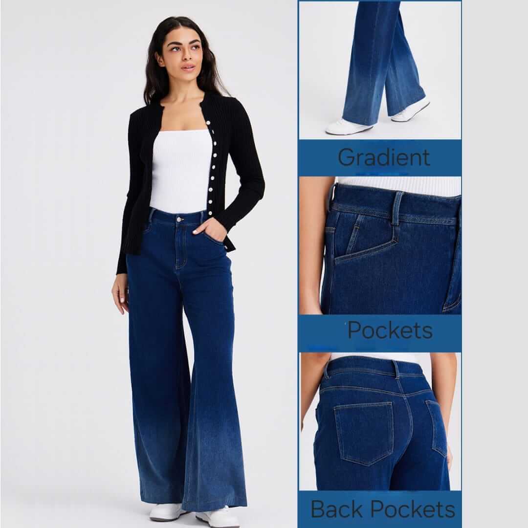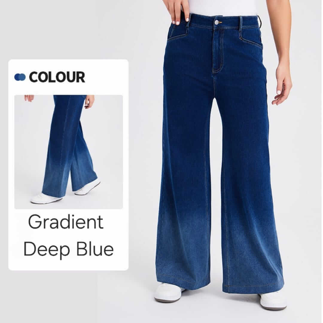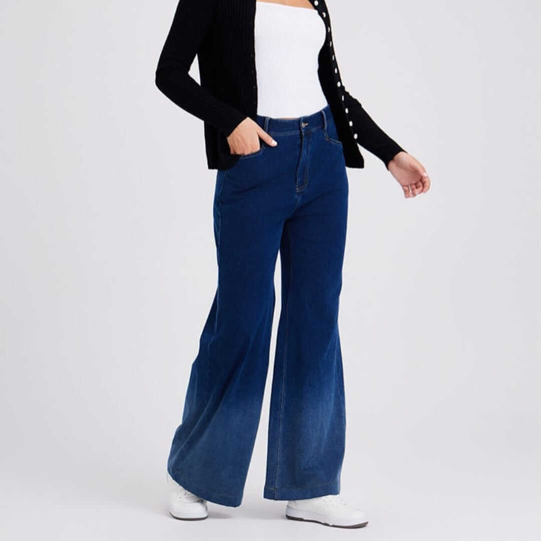 Trendy womens ombre gradient wide leg jeans offering a relaxed fit with eye-catching color fade and effortless style.