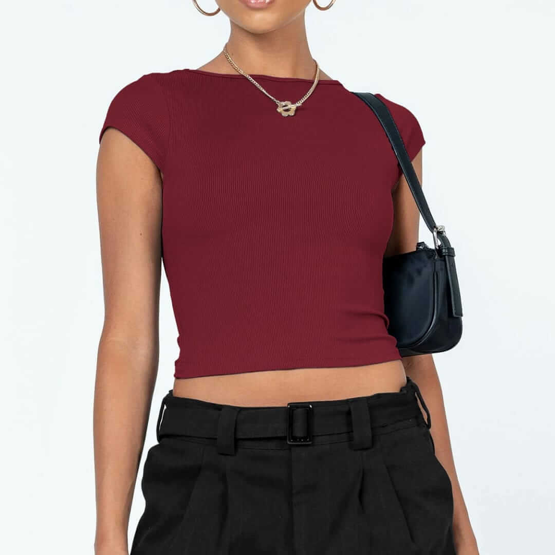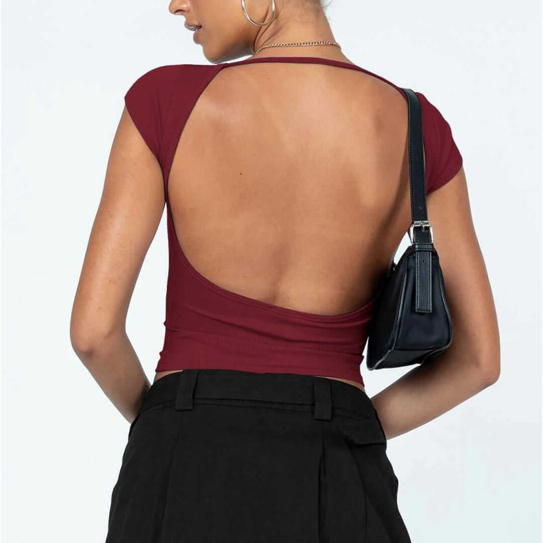 Trendy womens open back crop tee designed for a bold, stylish lookperfect for casual wear, workouts, or layering with your favorite outfits.