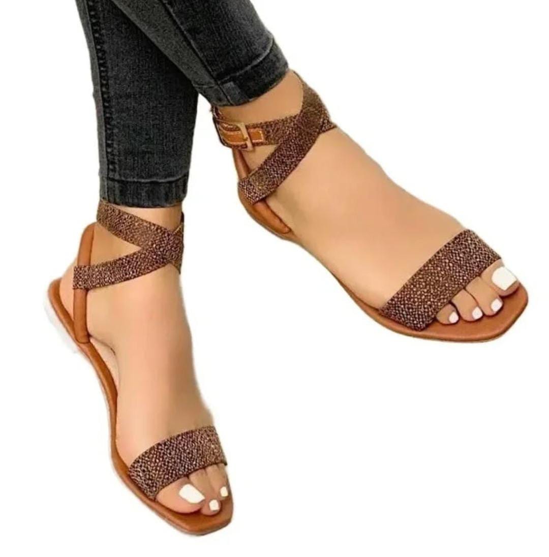 Stylish and comfortable Womens Open Toe Flat Sandals featuring a trendy cross buckle strap design. Perfect for casual outings, summer days, and everyday wear.