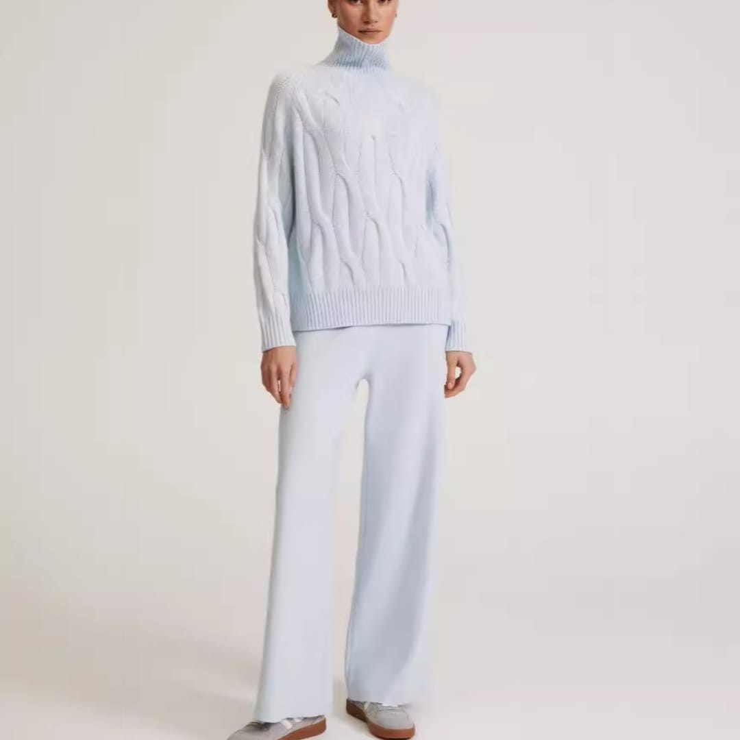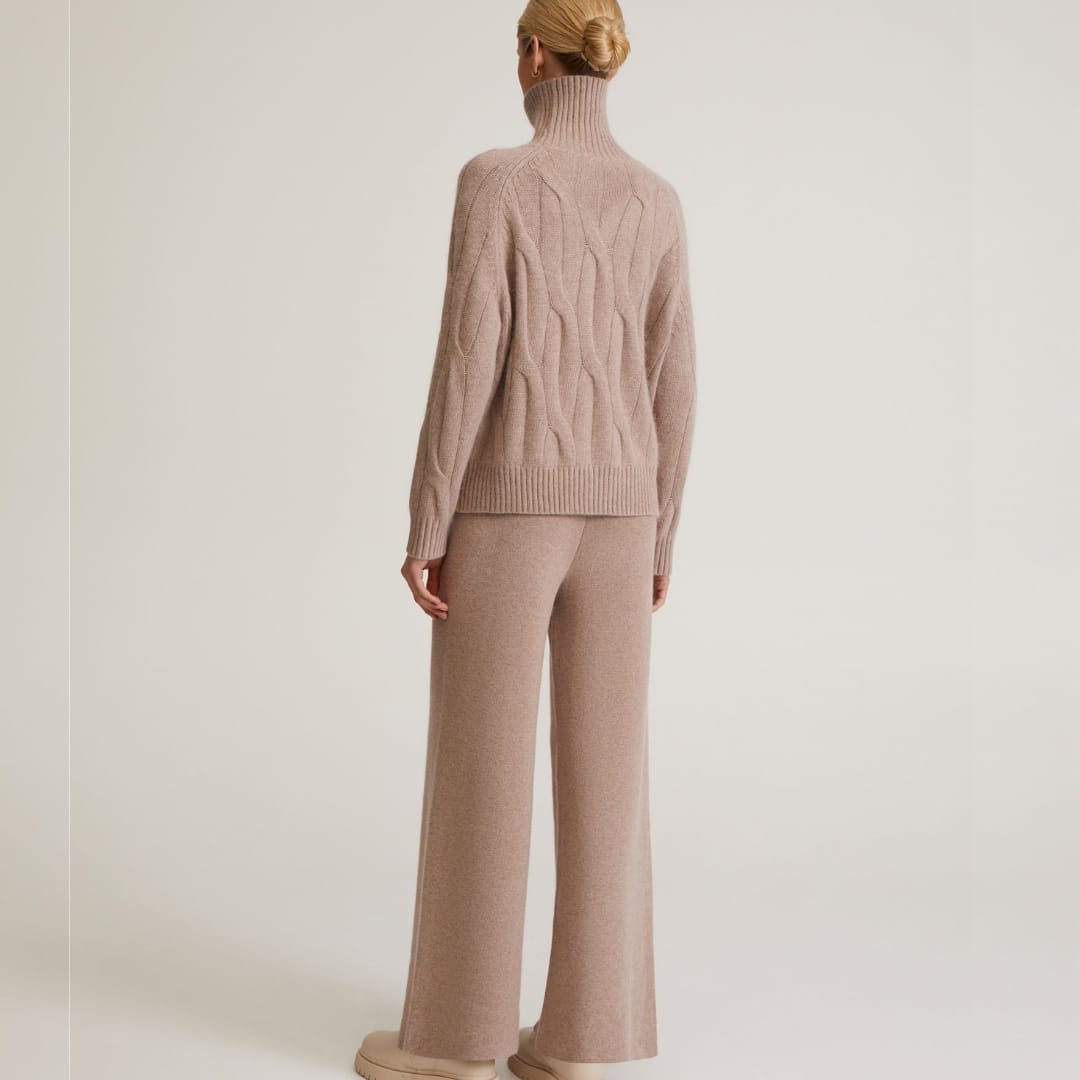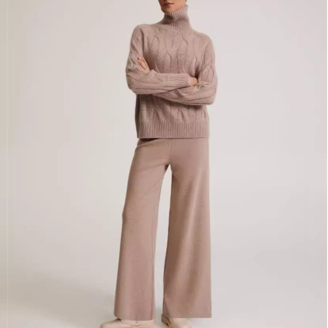 Cozy and coordinated, this patterned high collar and pants knitted set combines warmth with stylish design.