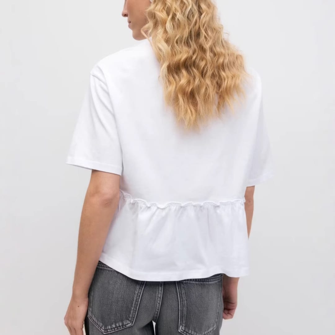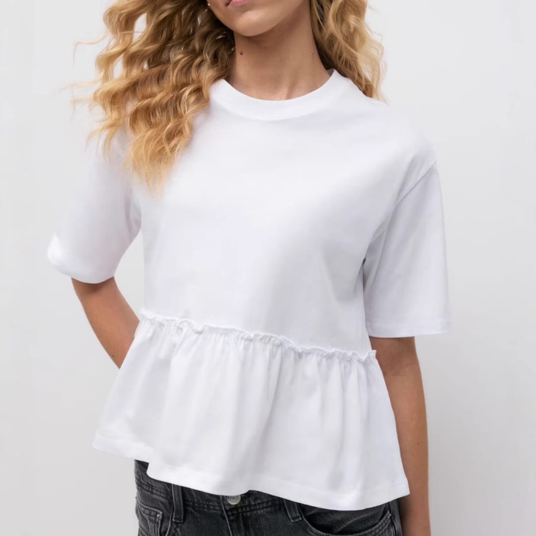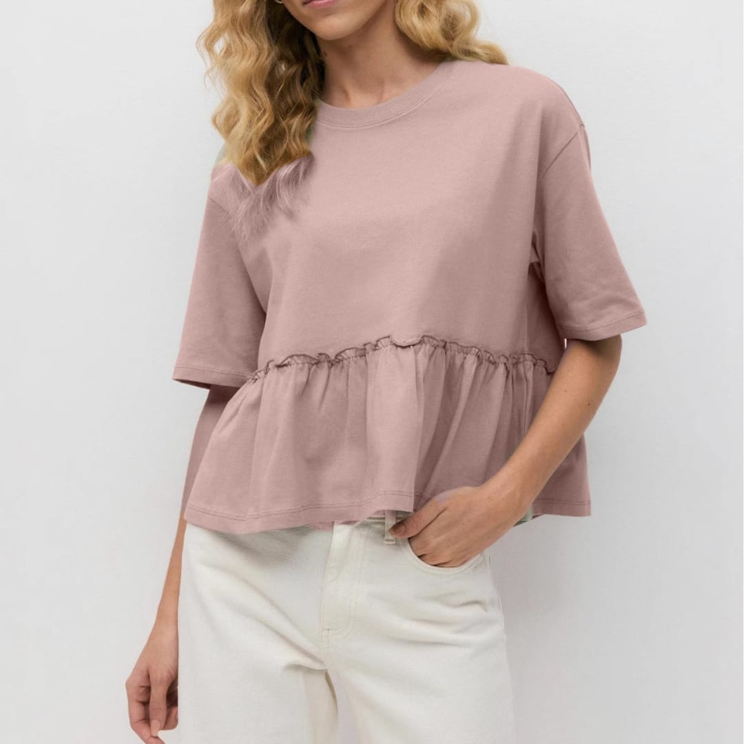 Flaunt feminine charm with this Peplum Tee featuring a cute ruffle hem—comfortable, stylish, and effortlessly flattering.