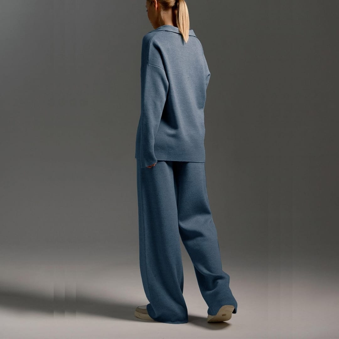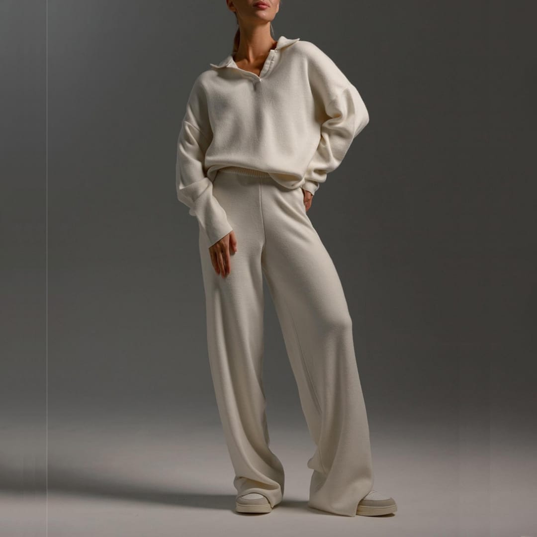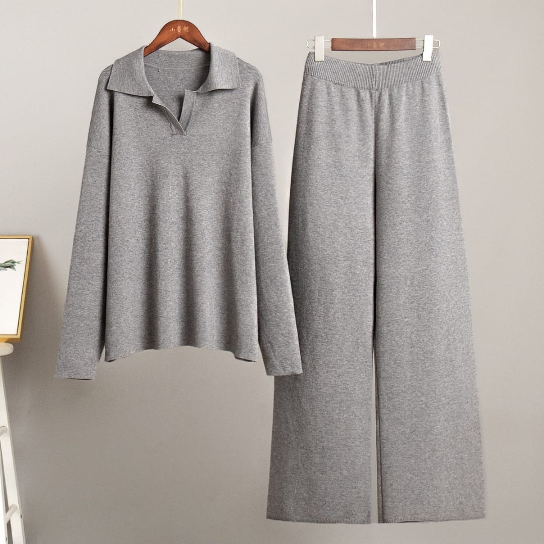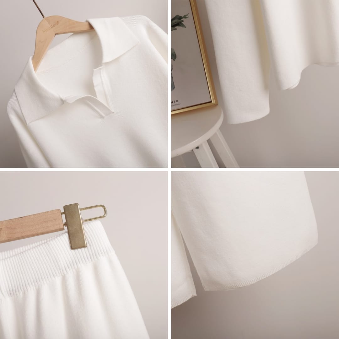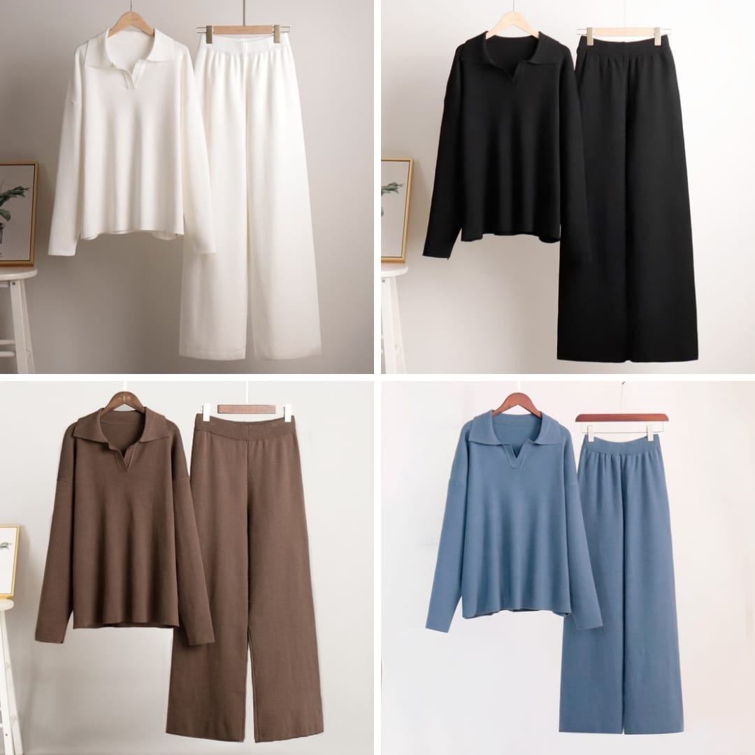 The Womens Thick Autumn and Winter Knitted Set combines luxurious comfort with timeless style. Crafted from premium thick knit fabric, this two-piece set includes a polo collar loose-fit sweater and casual wide-leg lounge pants that offer warmth without sacrificing elegance. The soft, breathable texture ensures all-day comfort, while the relaxed silhouette flatters every body shape. Ideal for cozy days indoors or casual outings, this matching set brings a refined yet laid-back aesthetic to your fall and winter wardrobe. Pair it with sneakers or boots for a polished, modern look that blends comfort, quality, and effortless sophistication.