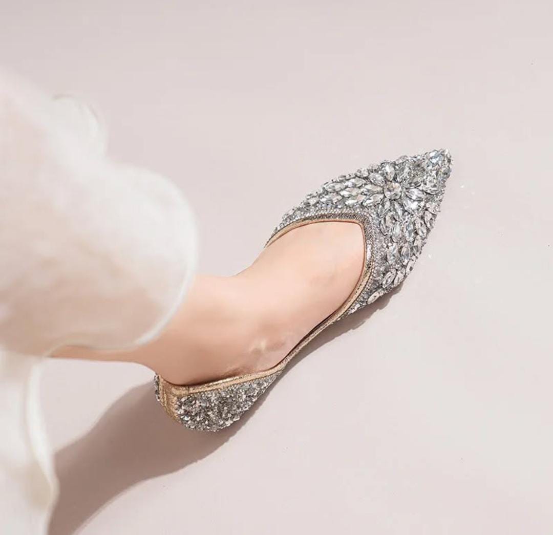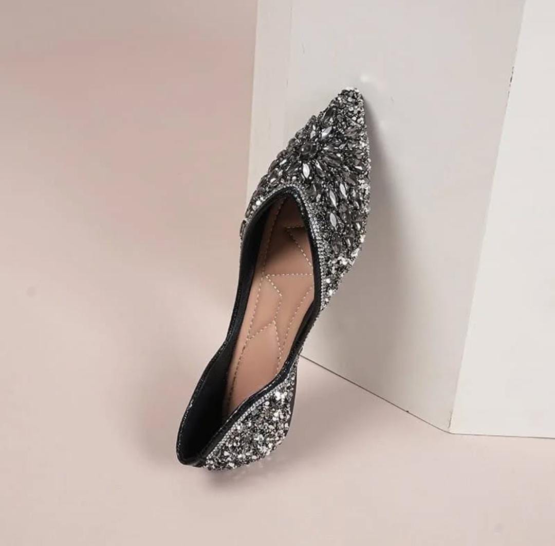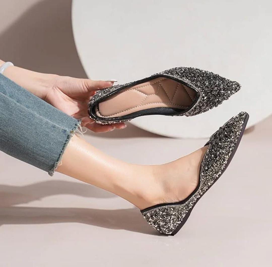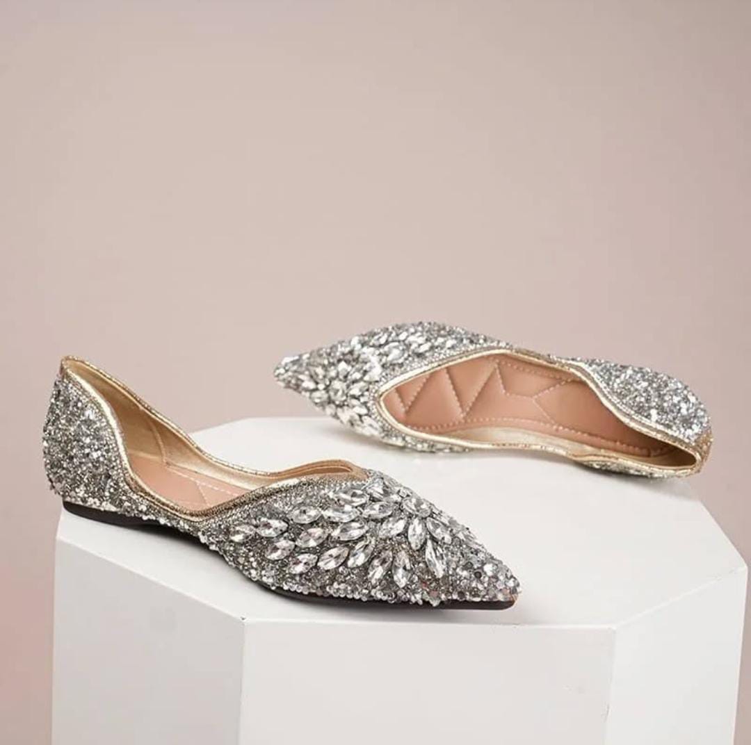Step into timeless elegance with these Women Rhinestone Beaded Pointed Toe Flat Ballerinas. Designed to combine comfort with glamour, these flats feature a sleek pointed toe silhouette enhanced by delicate rhinestone bead embellishments for a refined sparkle. The flat sole ensures all-day comfort, making them perfect for casual outings, office wear, parties, or festive occasions. Crafted to complement both ethnic and western outfits, these ballerinas add a touch of sophistication to any look. A must-have footwear choice for women who value style, elegance, and everyday comfort.