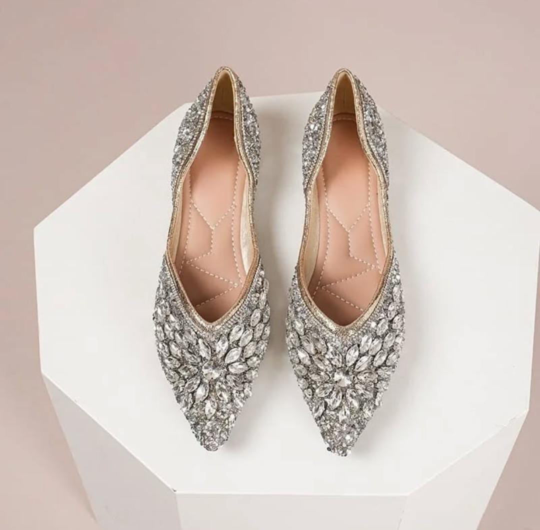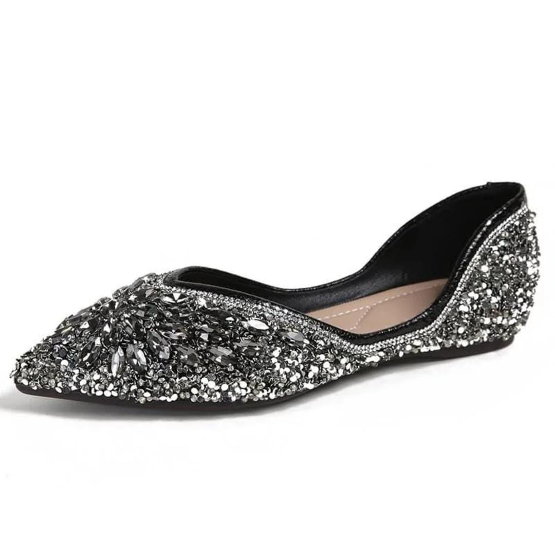 Elegant womens pointed toe flat ballerina shoes adorned with sparkling rhinestone beads, offering chic style, comfort, and versatility for everyday wear or special occasions.