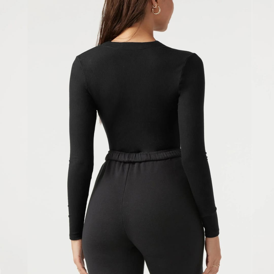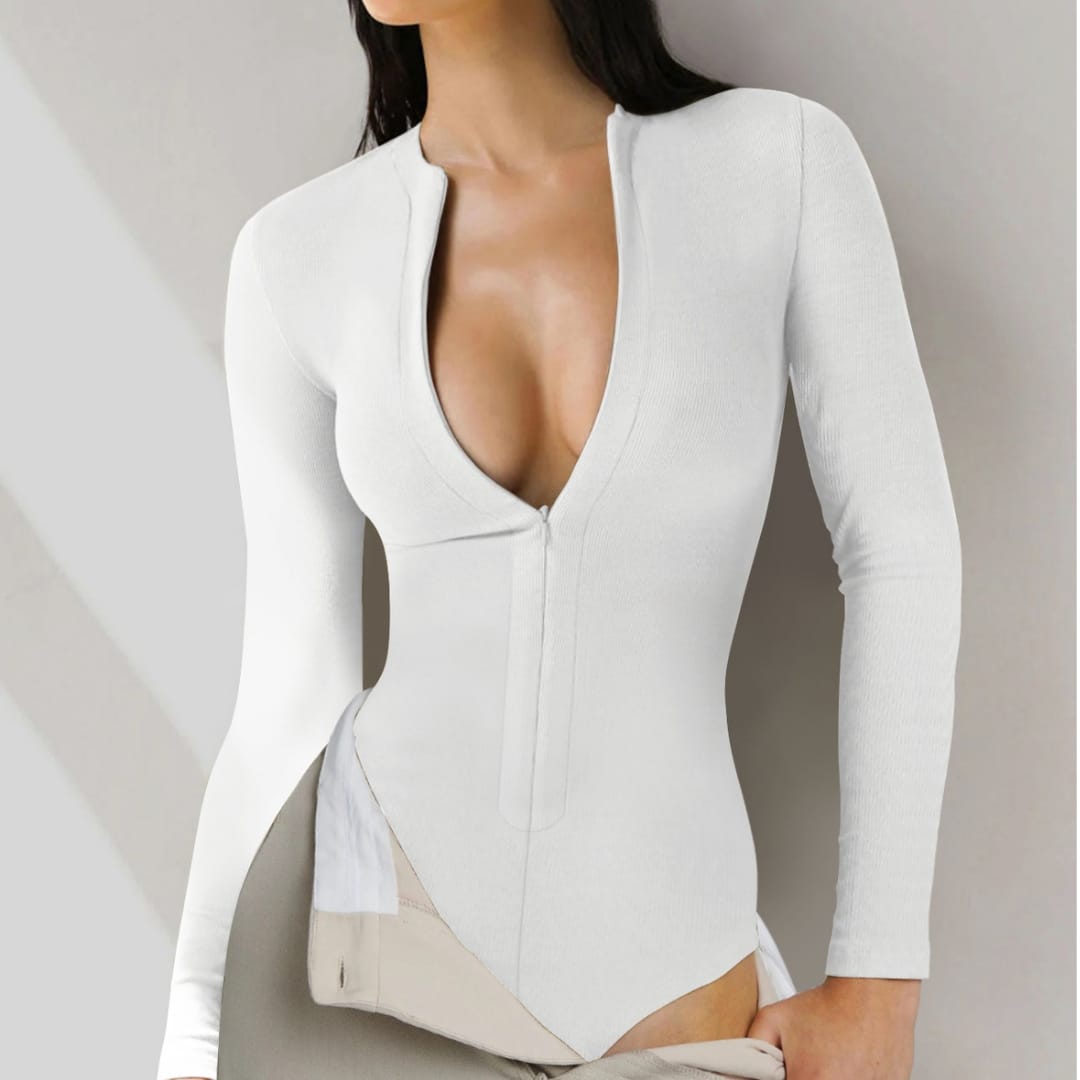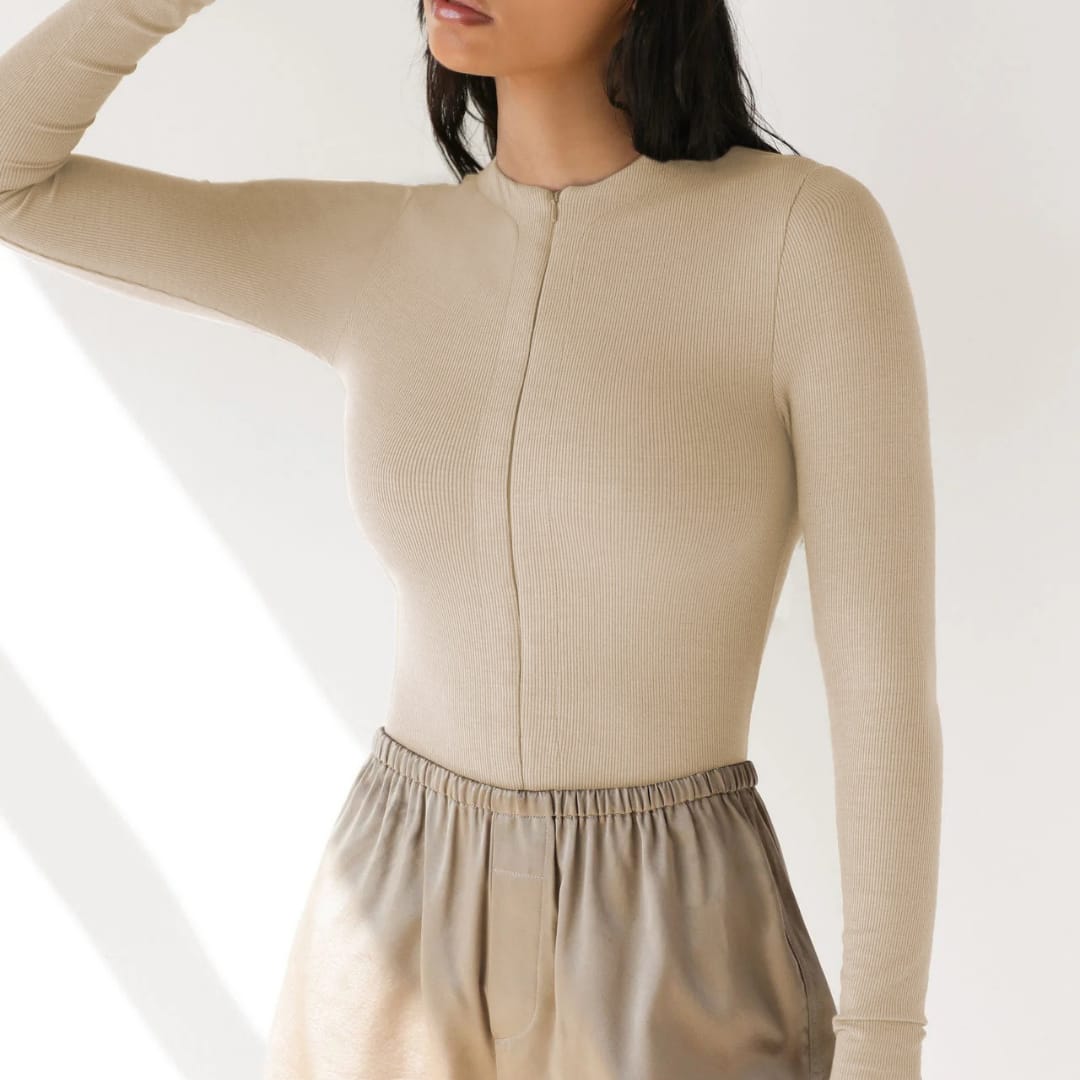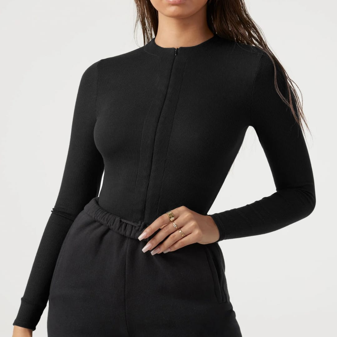 Sleek ribbed knitted bodysuit with front zipper detail combining comfort, structure, and modern edge.