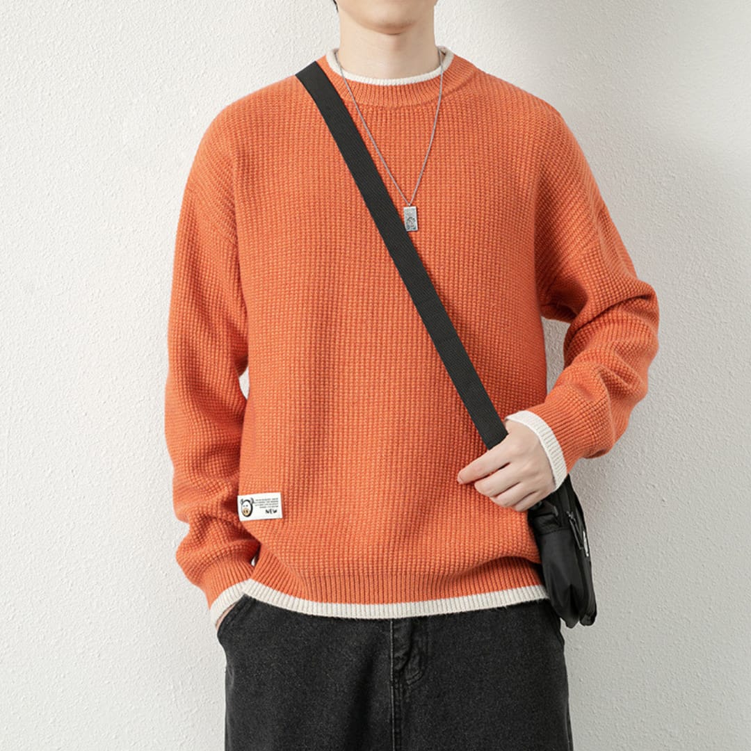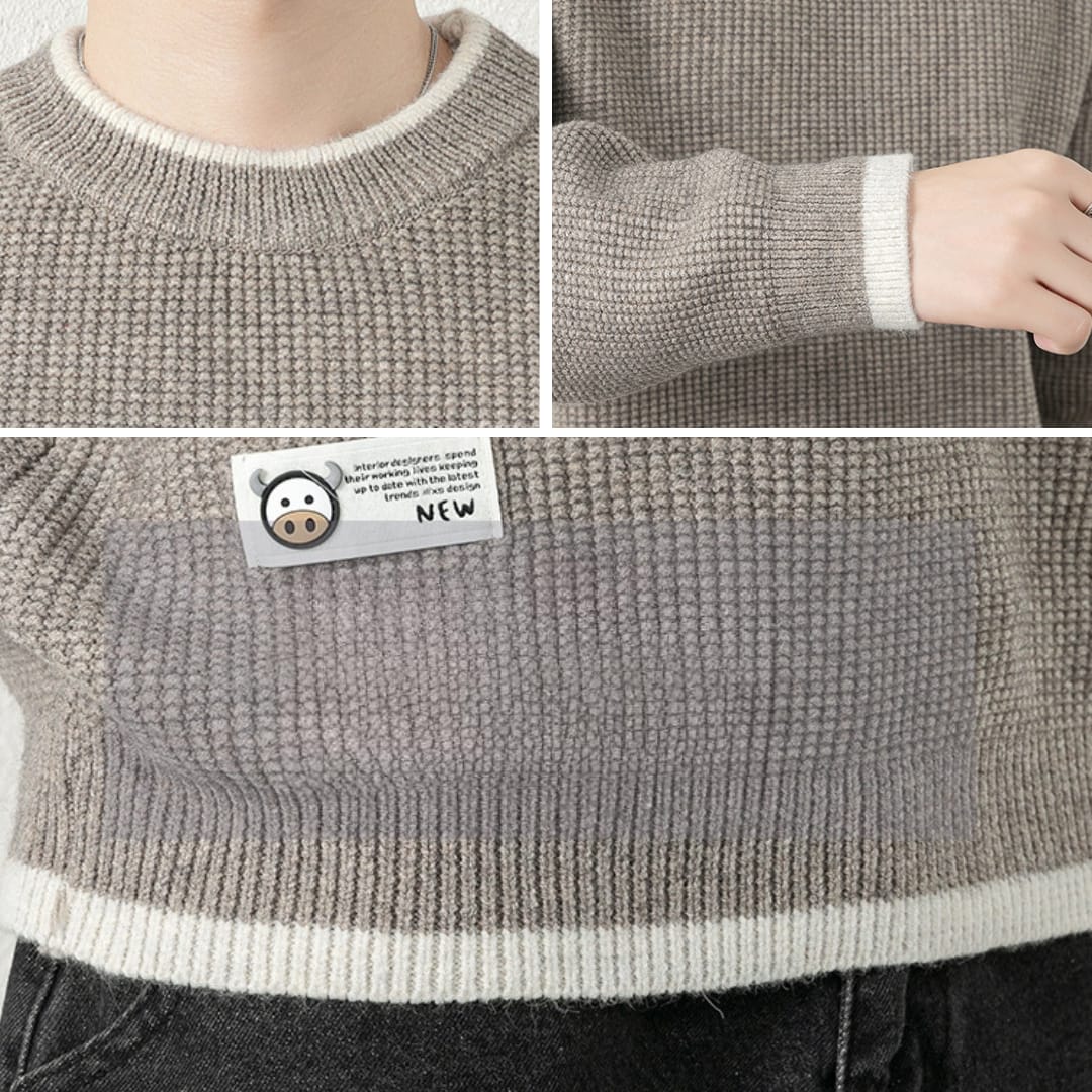 Mens round neck ribbed sweater warm, stylish, and perfect for autumn and winter casual wear.