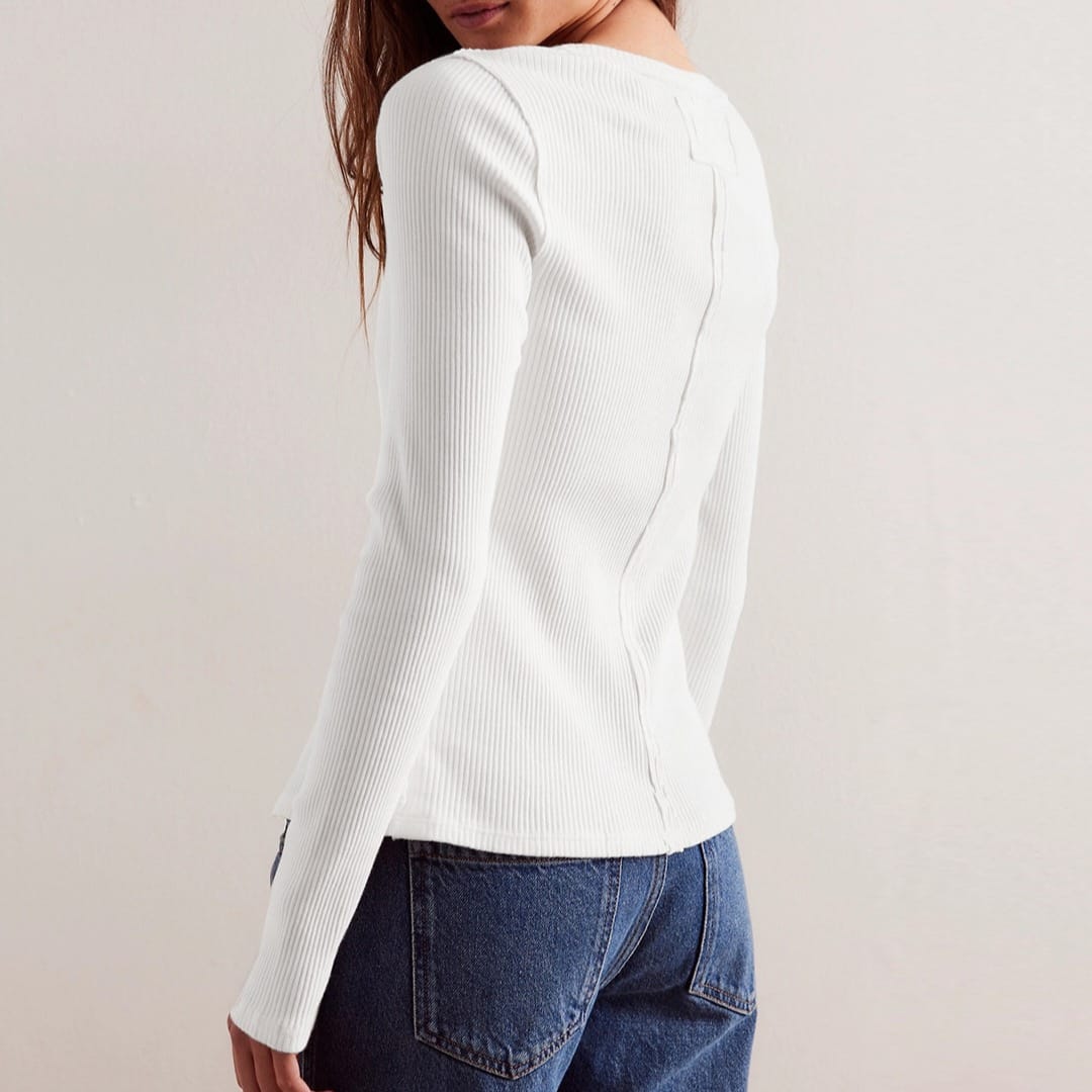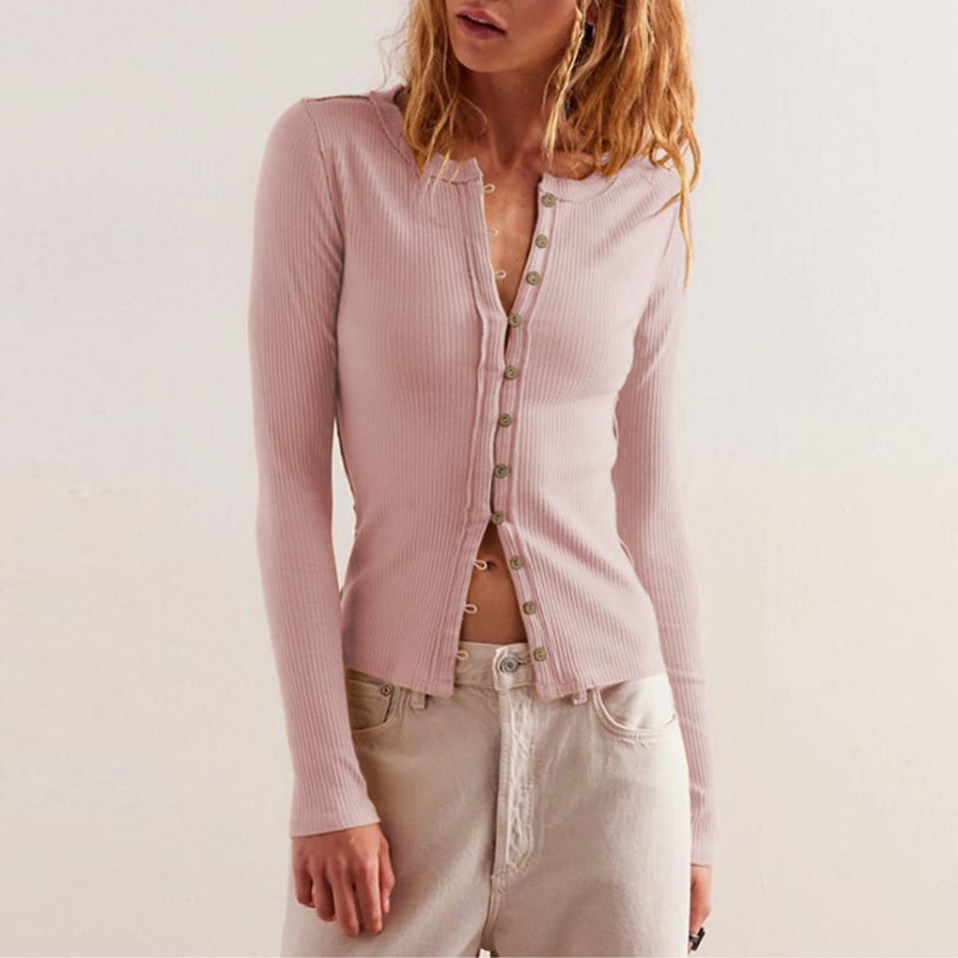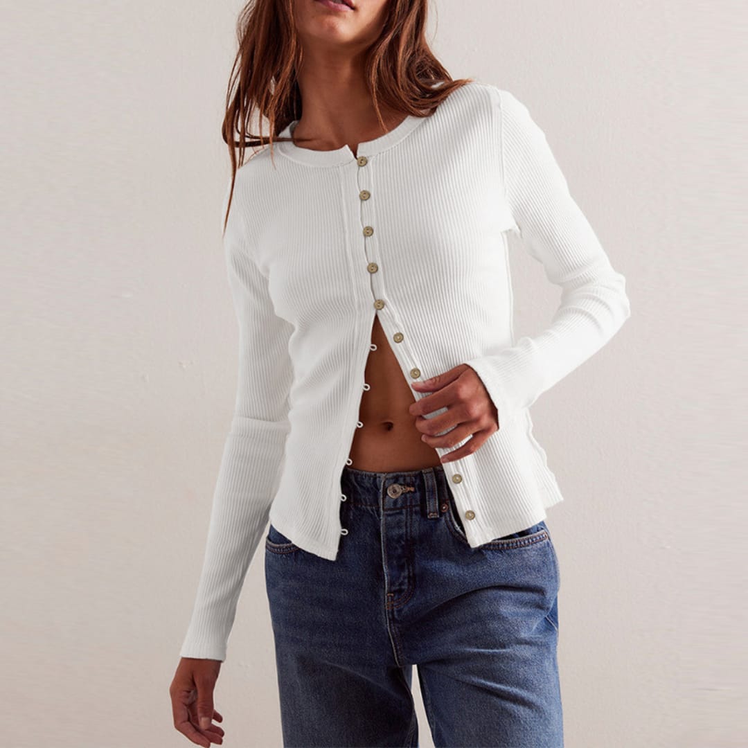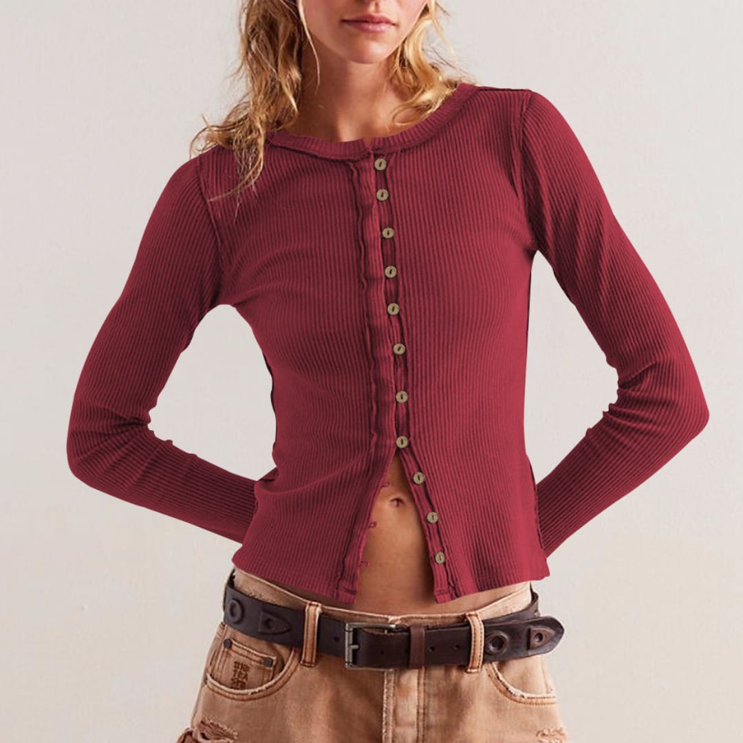 Classic round neck ribbed cardigan top with button-up front for a timeless and versatile style.