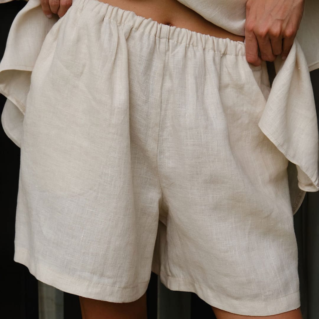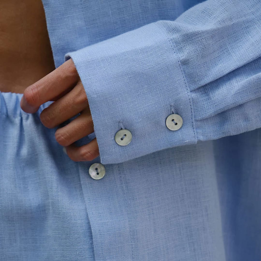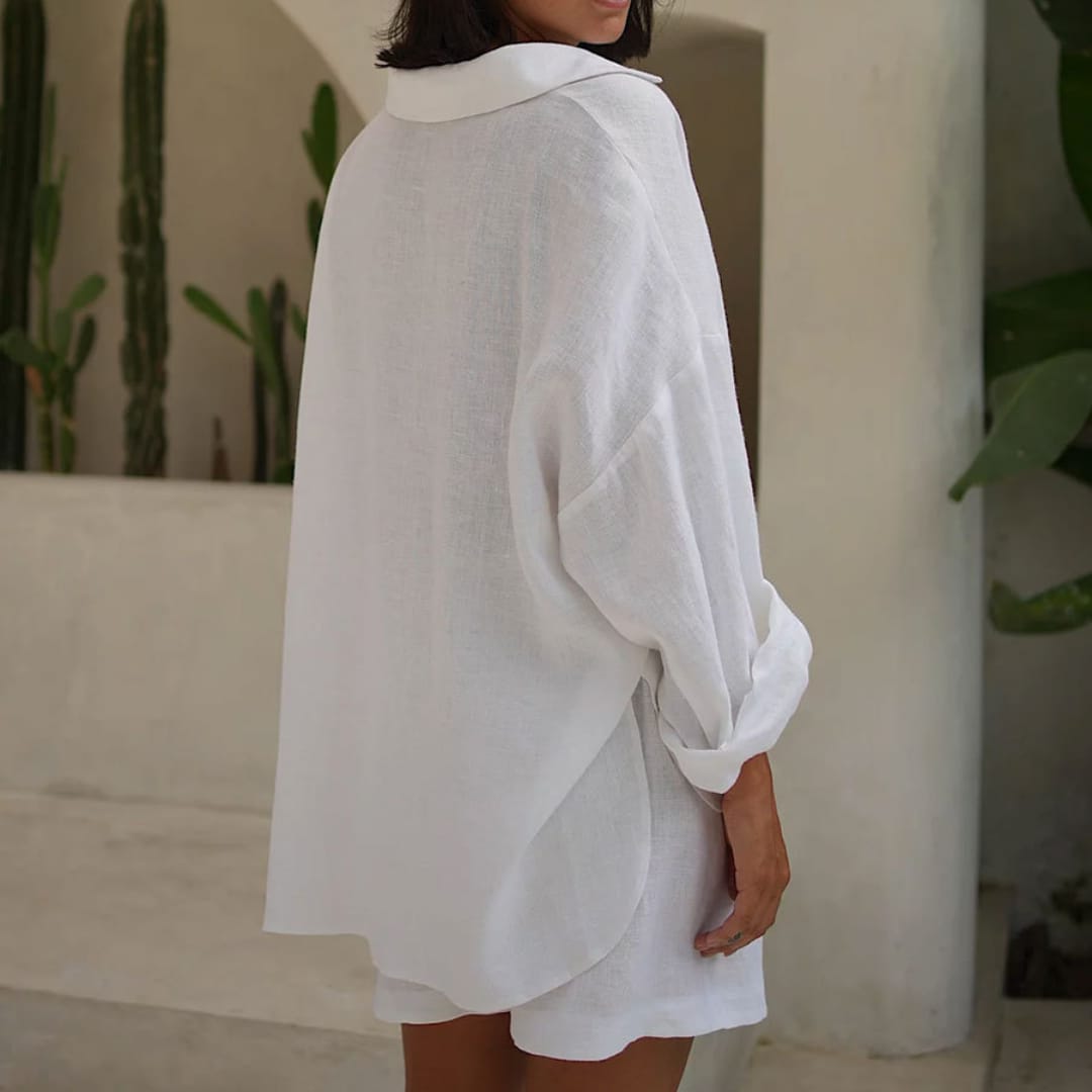 Lightweight summer set featuring a long-sleeved loose-fit shirt and matching shorts, perfect for casual and comfortable wear.