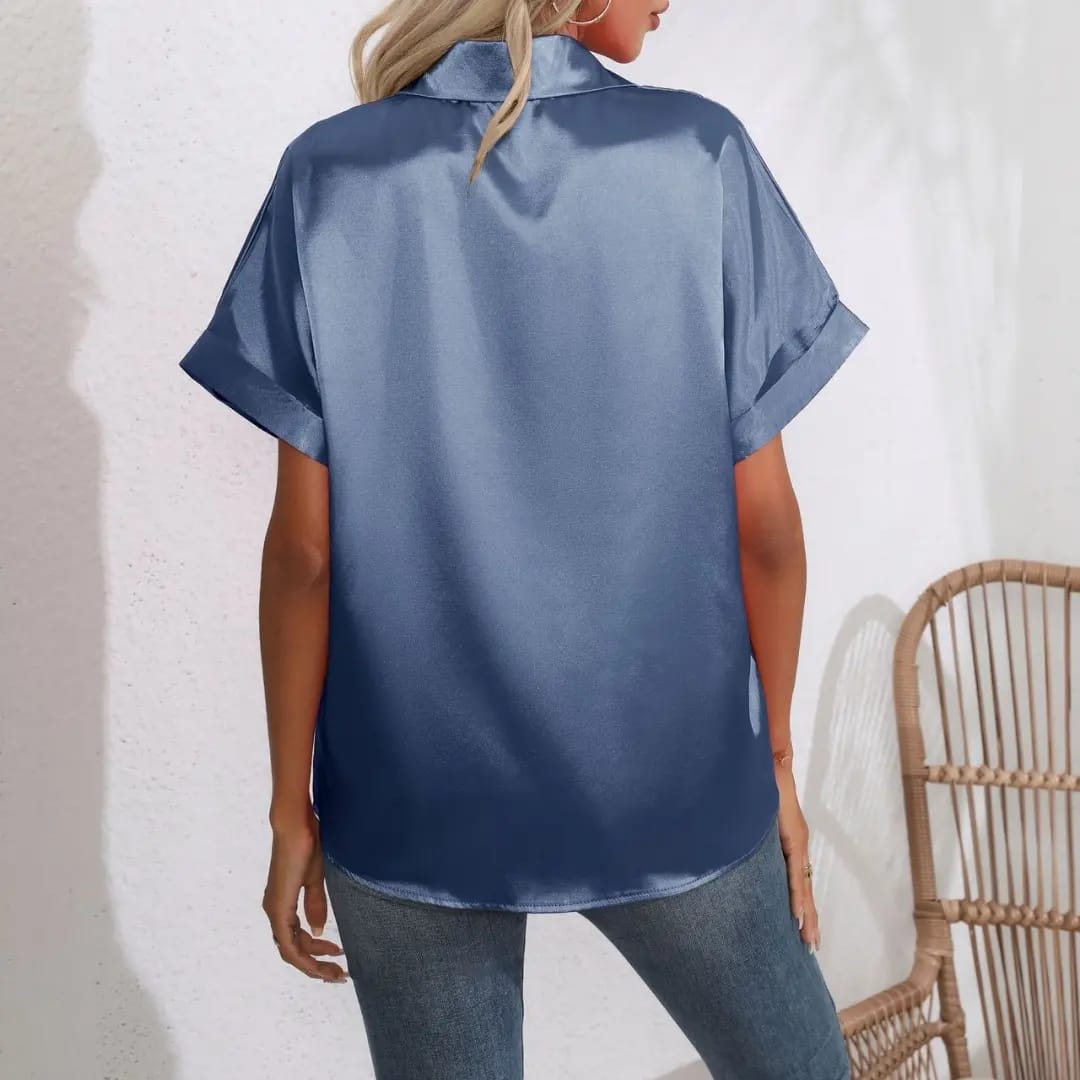 Stay effortlessly stylish with this Women’s Short Sleeve Basic Satin Shirt, designed with a silky-smooth finish and a modern, minimalist cut for everyday elegance.