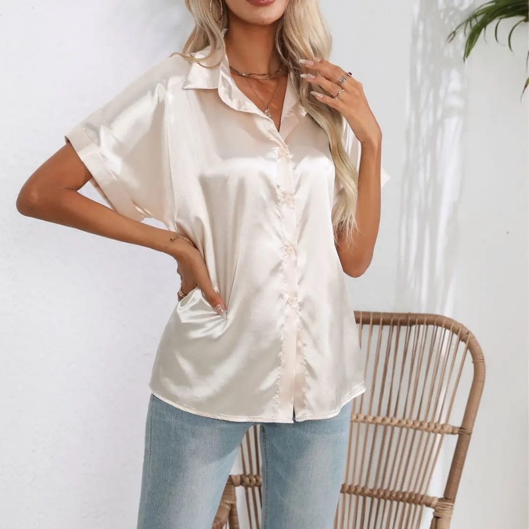 Elevate your wardrobe with the timeless charm of this Women’s Short Sleeve Basic Satin Shirt. Crafted from soft, luxurious satin, it offers a sleek and polished look that’s perfect for both casual and professional settings. The short sleeves and relaxed fit provide breathable comfort, while the subtle sheen adds a touch of sophistication. Pair it with tailored trousers for work or jeans for a chic off-duty ensemble. Whether layered or worn solo, this satin shirt is a wardrobe essential that blends comfort and style effortlessly.