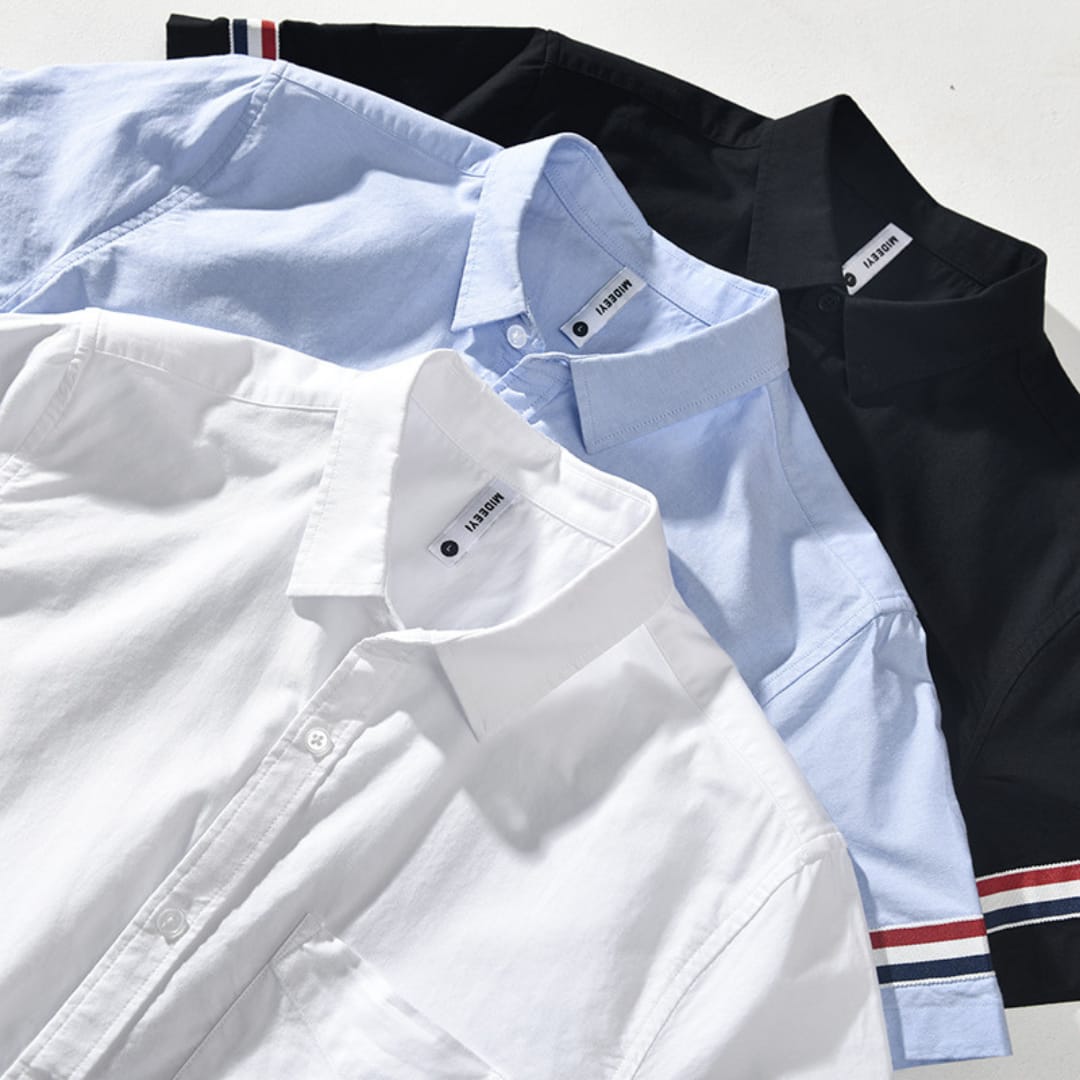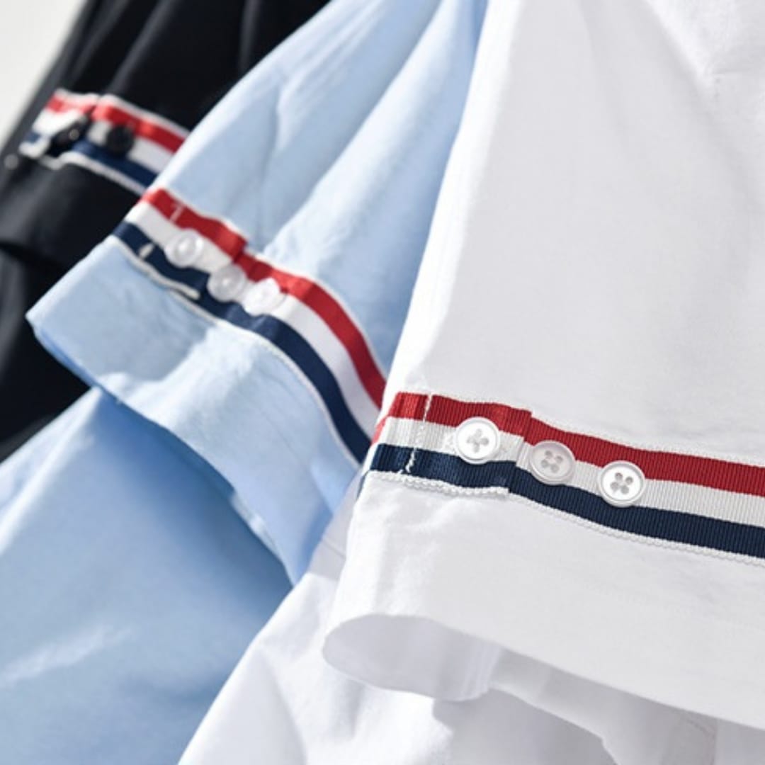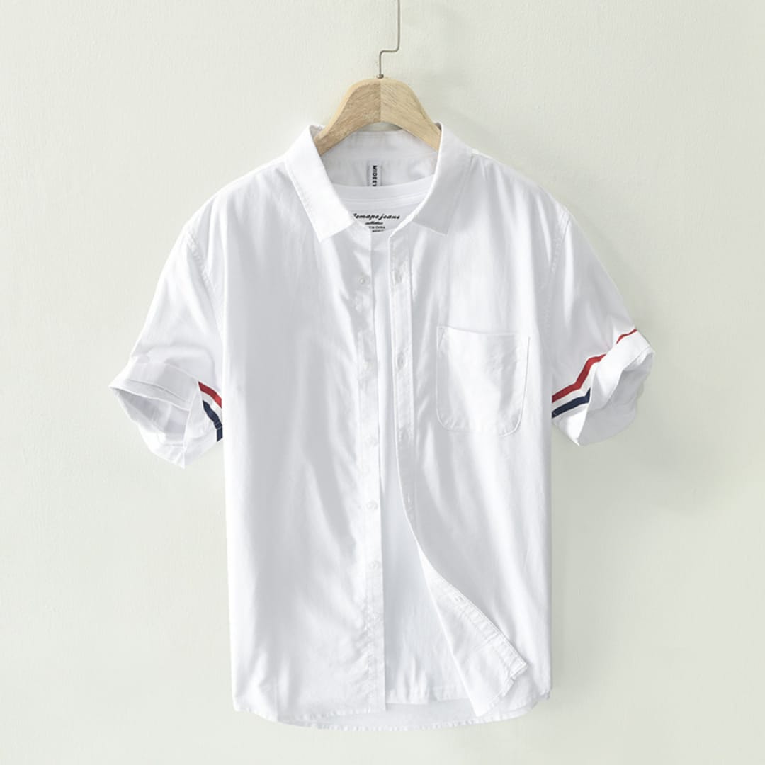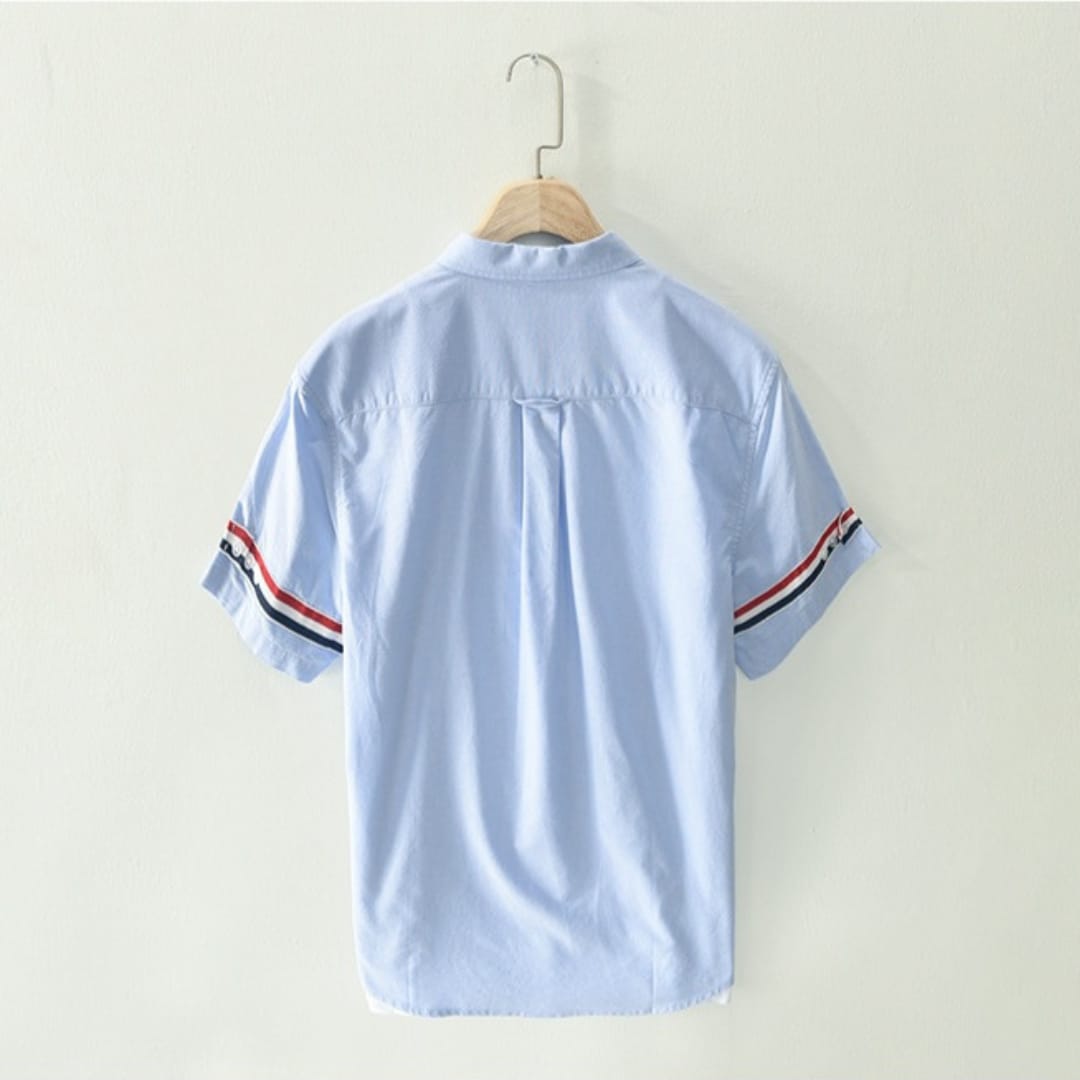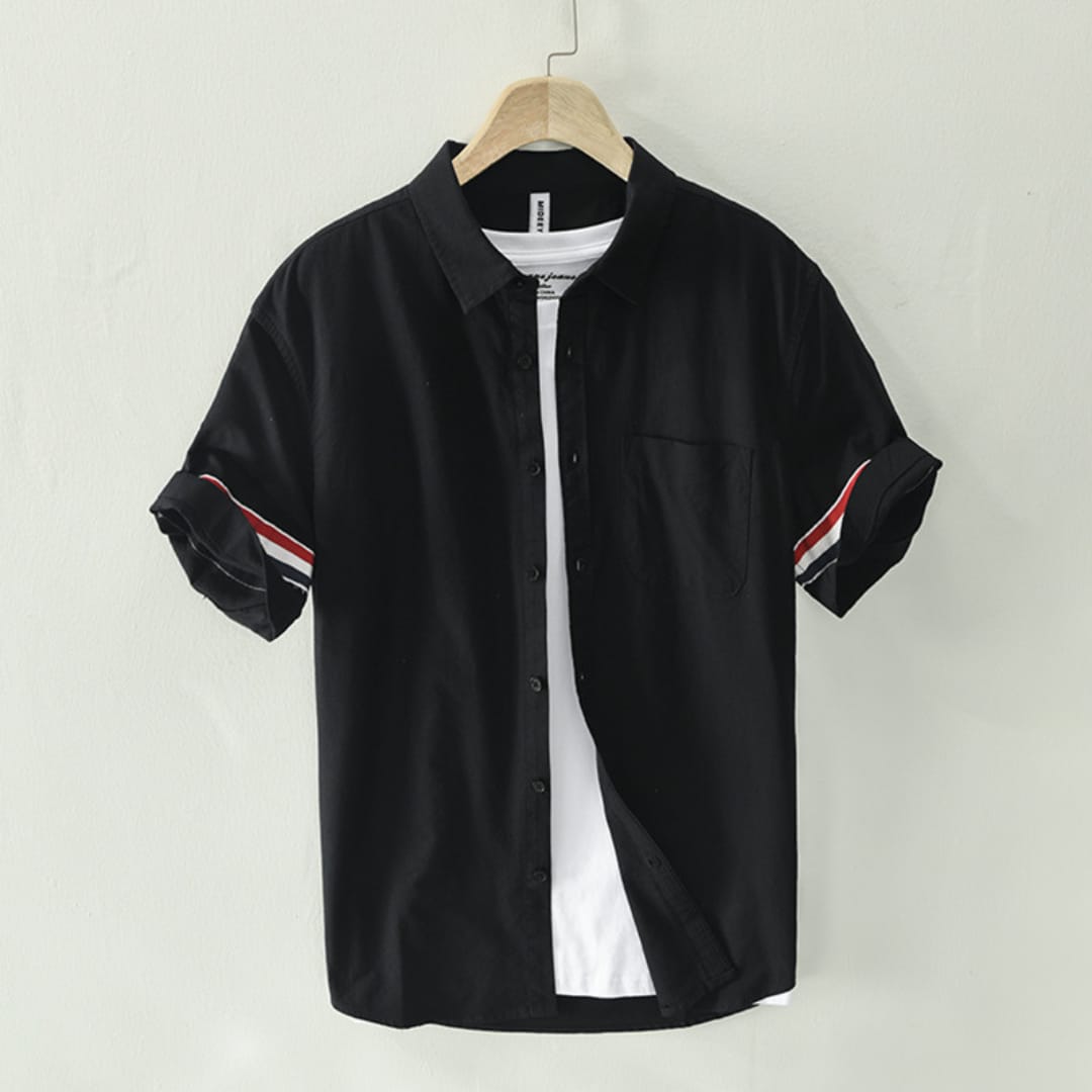 Stylish men’s short sleeve shirt with unique patchwork sleeves, perfect for a bold and modern casual look.