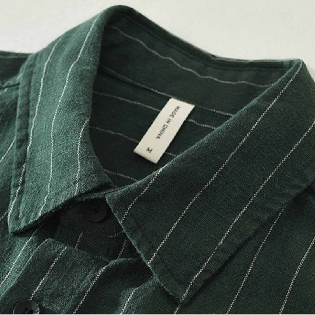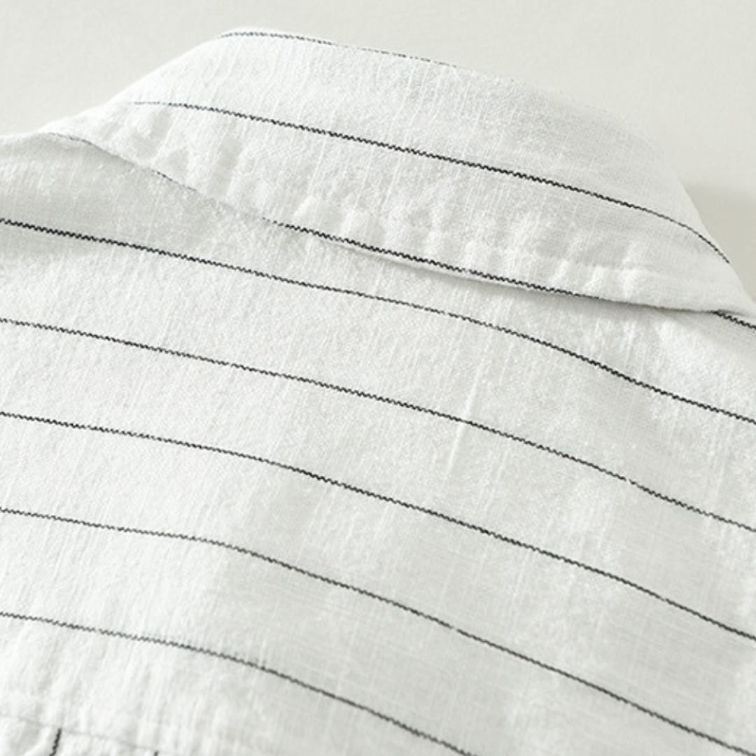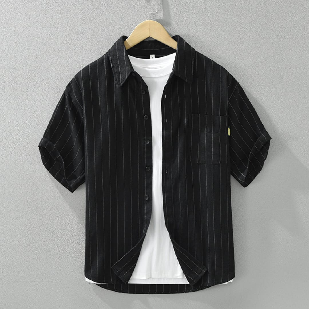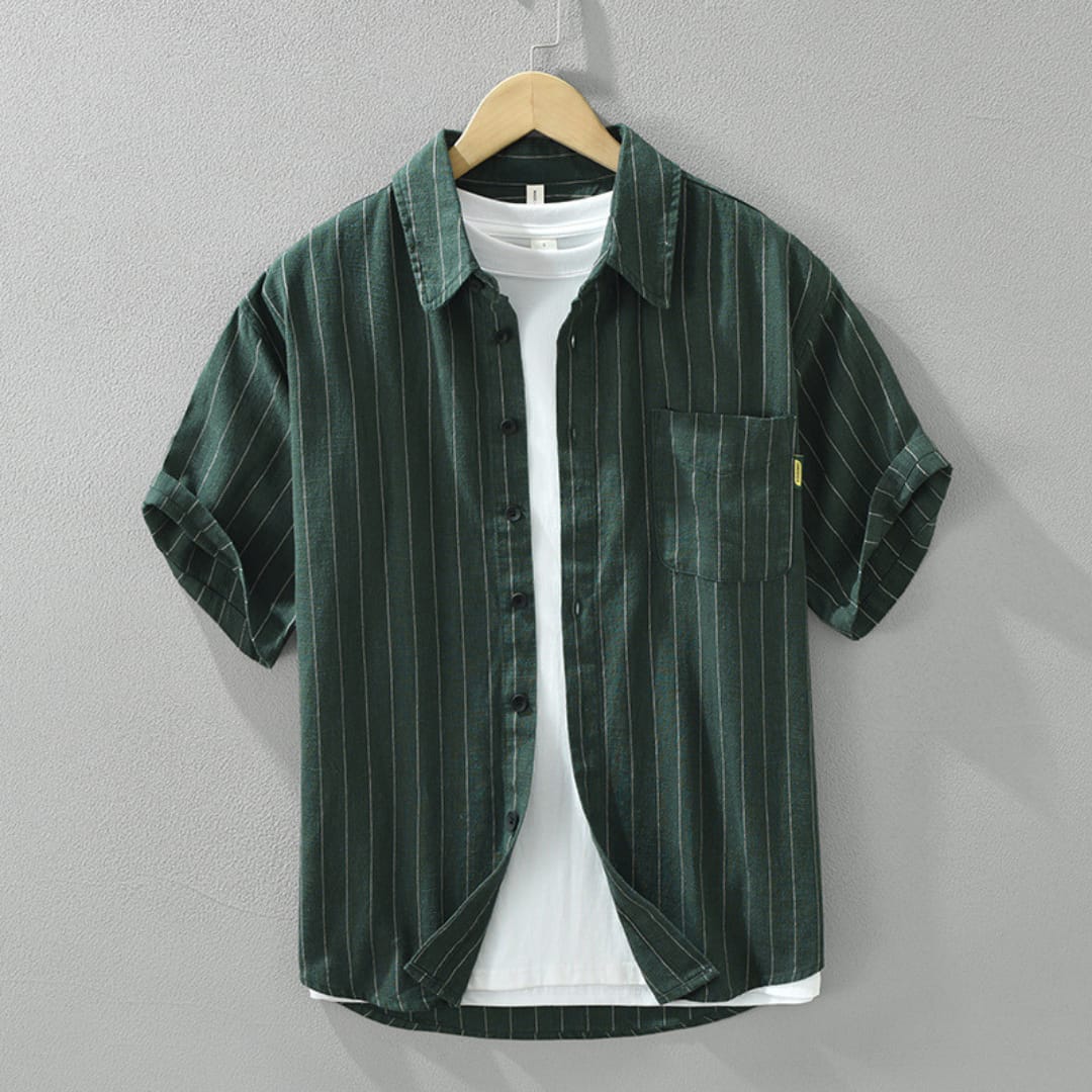Men’s short sleeve striped linen shirt with breathable fabric, relaxed fit, and timeless patternperfect for summer comfort and style.