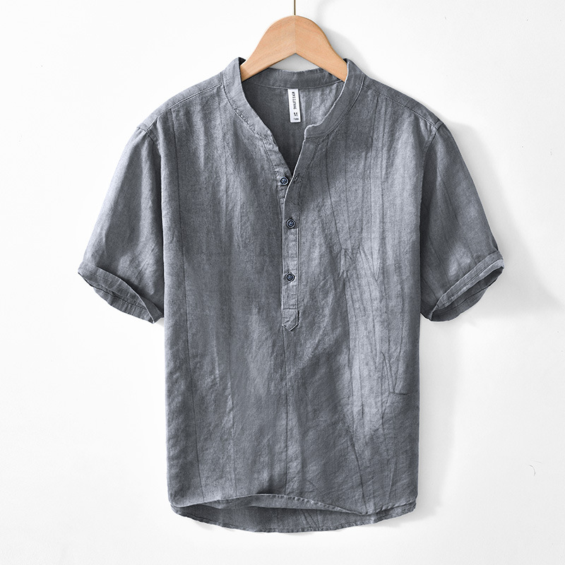 Mens short-sleeved boho V-neck shirt made from breathable ramie and cotton. Loose, comfortable fit perfect for summer, casual outings, or beachwear.