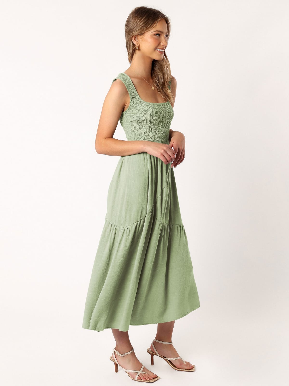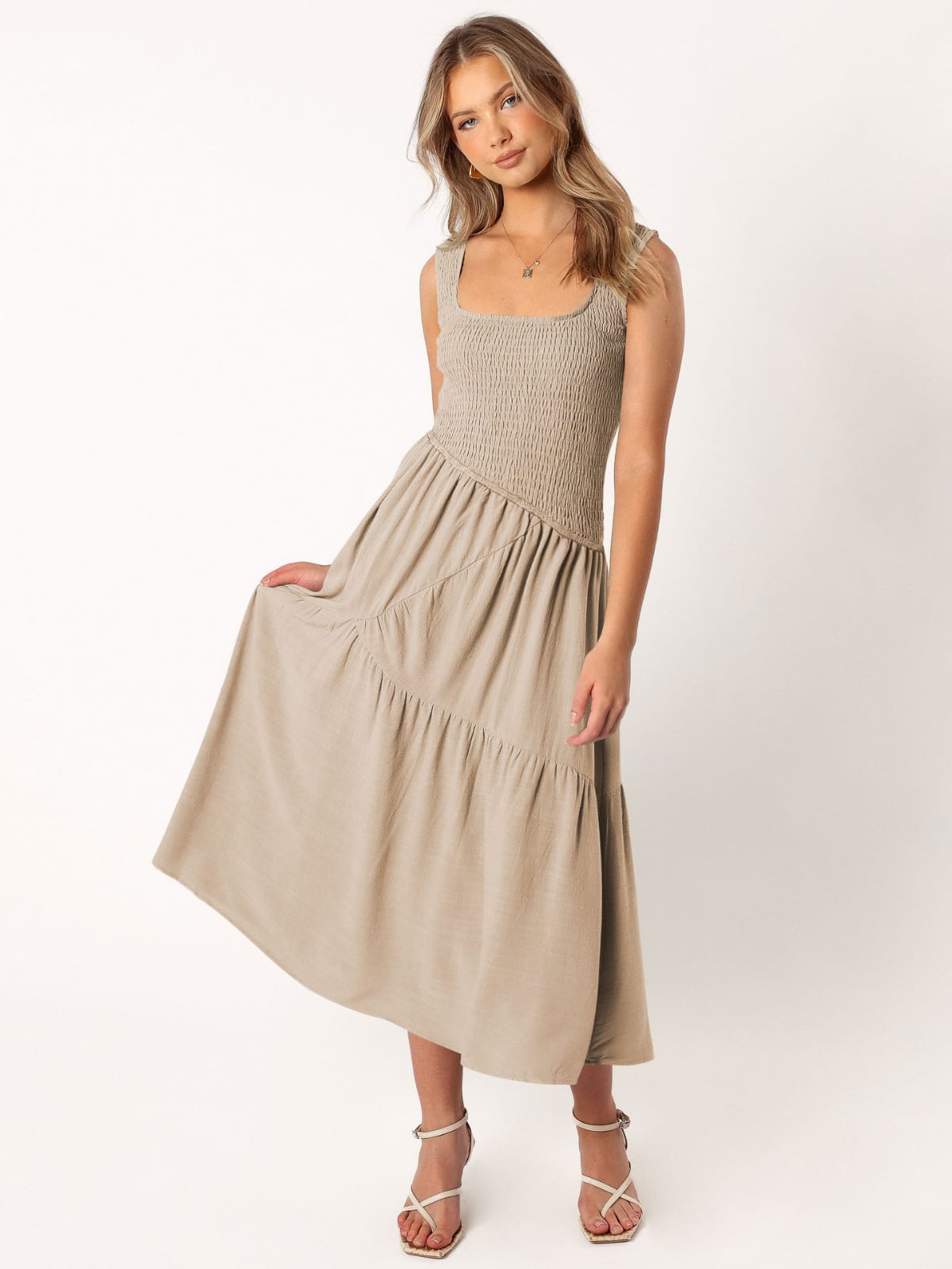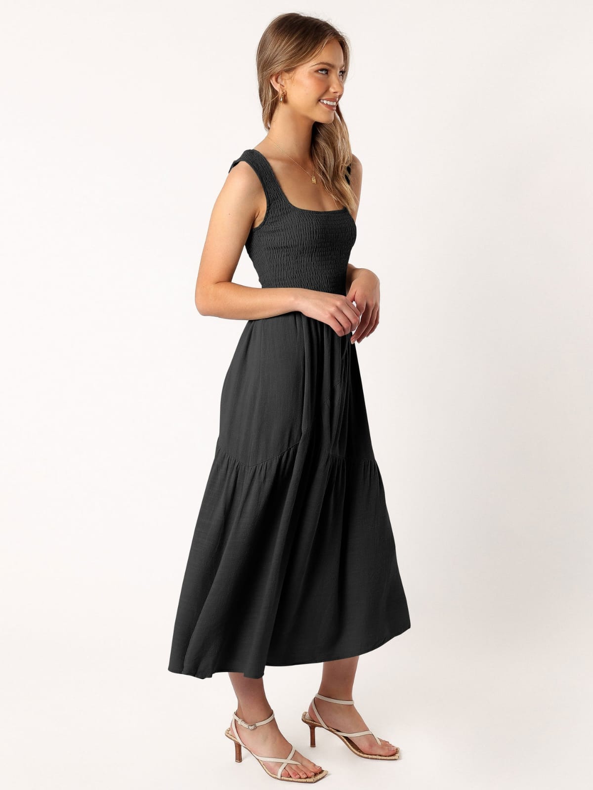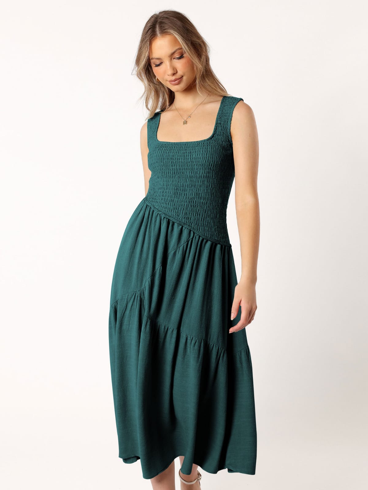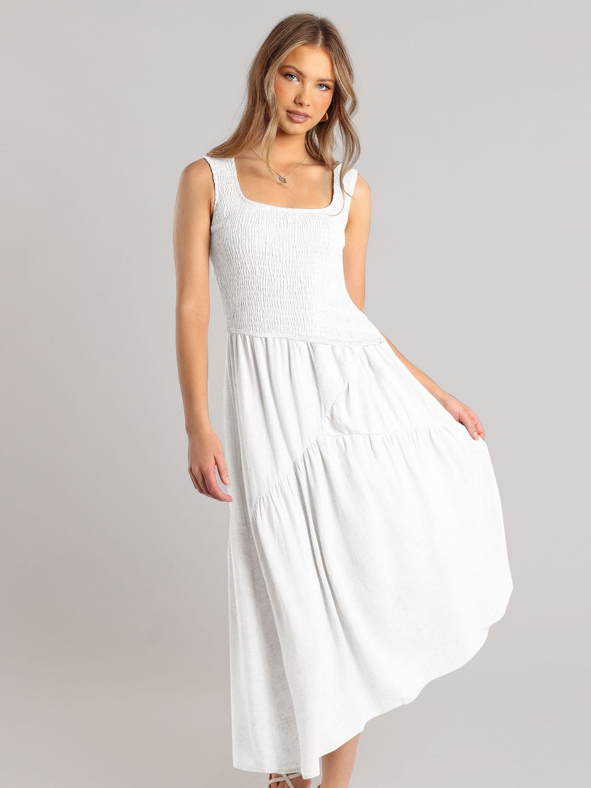 Turn heads in our Smocked Dress with Asymmetrical Hem feminine, flattering, and full of effortless movement for day-to-night wear.