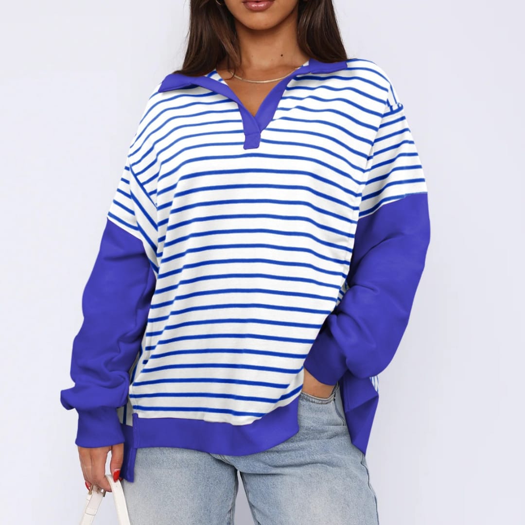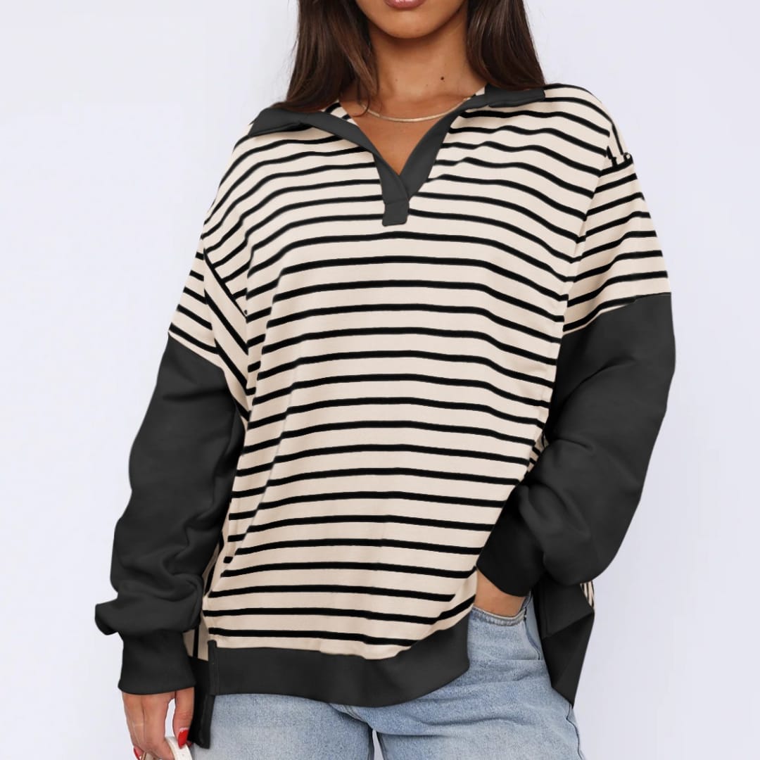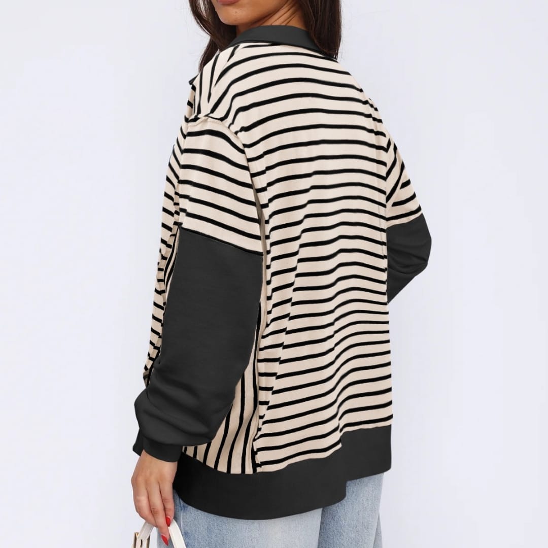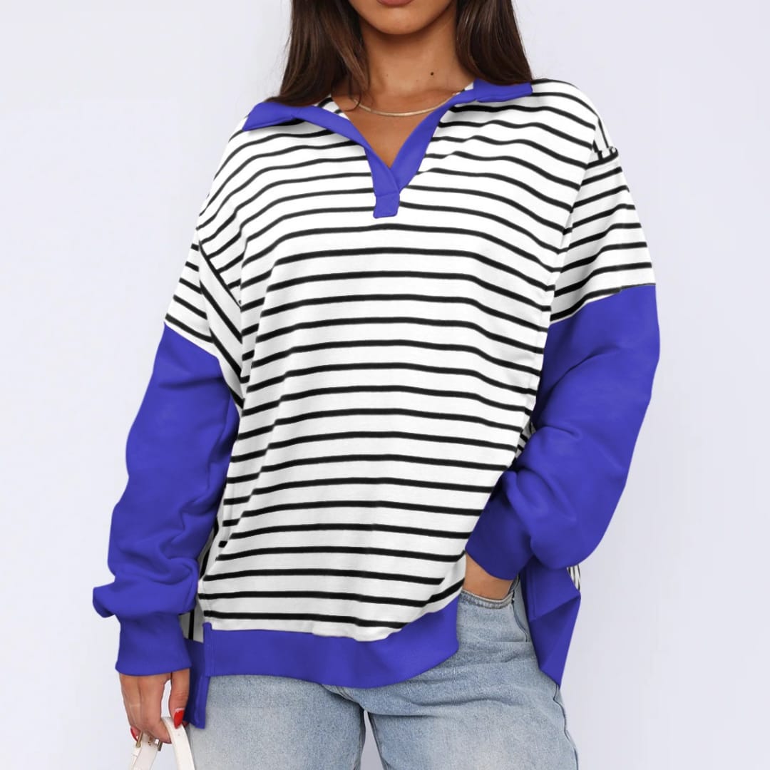 Elevate your casual wardrobe with our Striped Contrast Color Sweatshirt, designed to add a playful pop of color to your everyday look. Made from soft, breathable fabric, this sweatshirt features striking contrasting stripes that create a dynamic and stylish appearance. The relaxed fit and comfortable material make it perfect for lounging, running errands, or casual outings. Pair it with jeans, joggers, or leggings for effortless style and warmth. A versatile piece that combines comfort with eye-catching design, this sweatshirt is a must-have for those who love bold, sporty fashion.