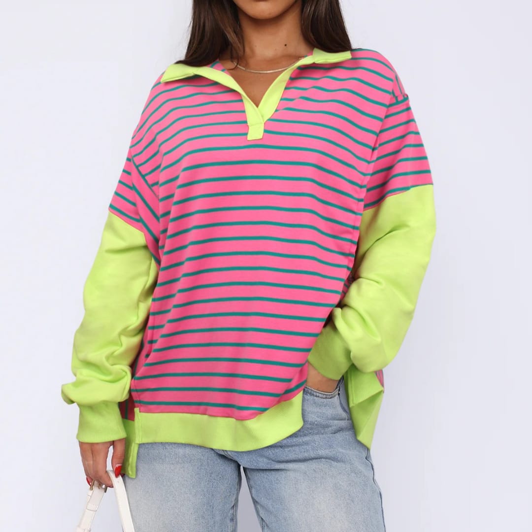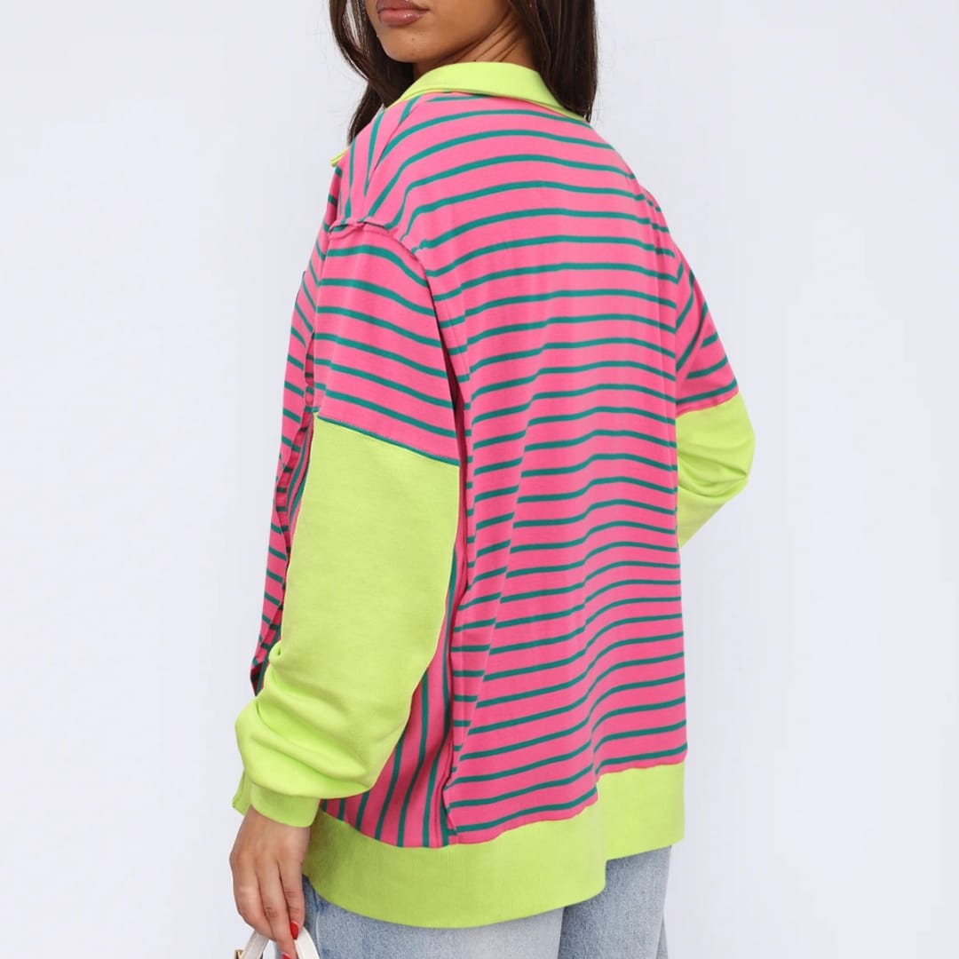 Stay cozy and trendy with our Striped Contrast Color Sweatshirt, featuring bold stripes and vibrant hues.