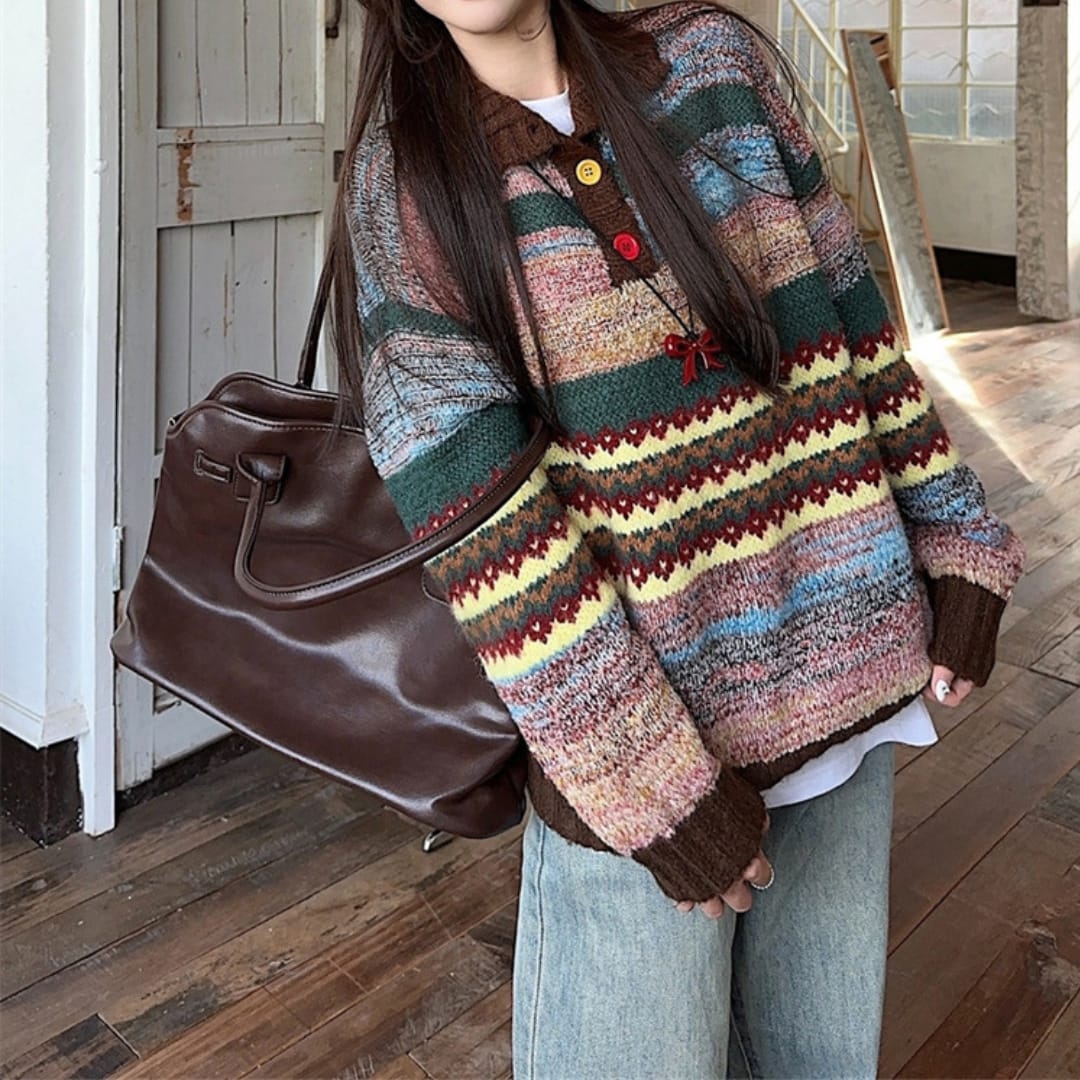 Striped Knitted Colorful Polo Collar Sweater