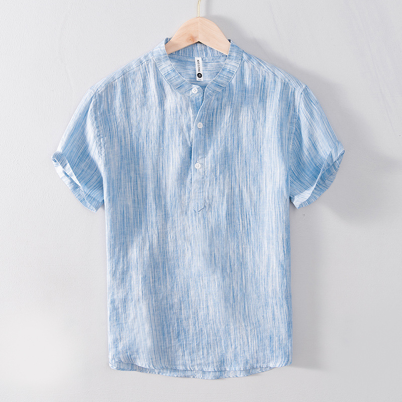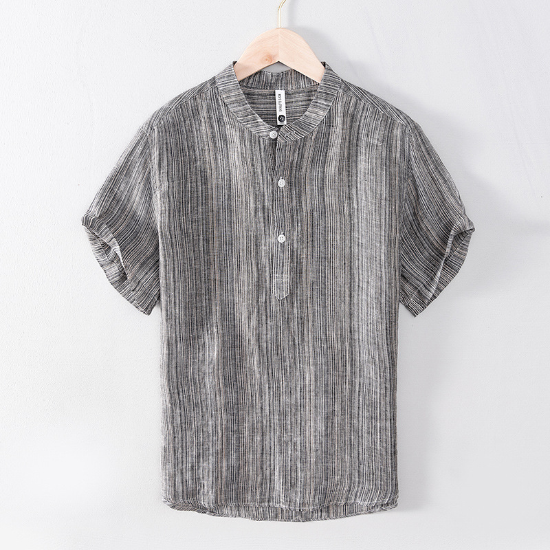 Mens striped casual T-shirt made from breathable pure linen, featuring a 3-button placket for a stylish and relaxed summer look.