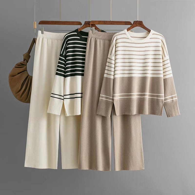 Cozy and stylish, this striped sweater and knitted pants set offers effortless comfort and a trendy casual look for everyday wear.
