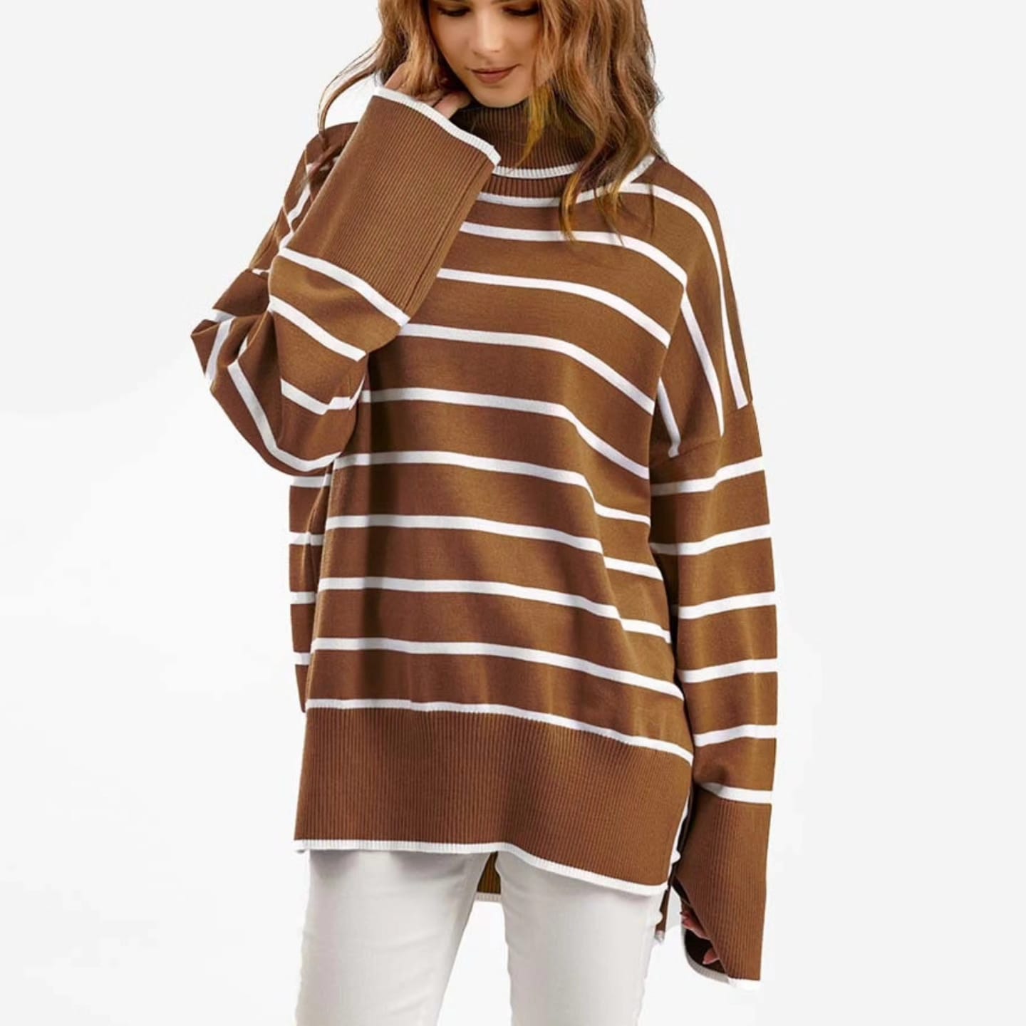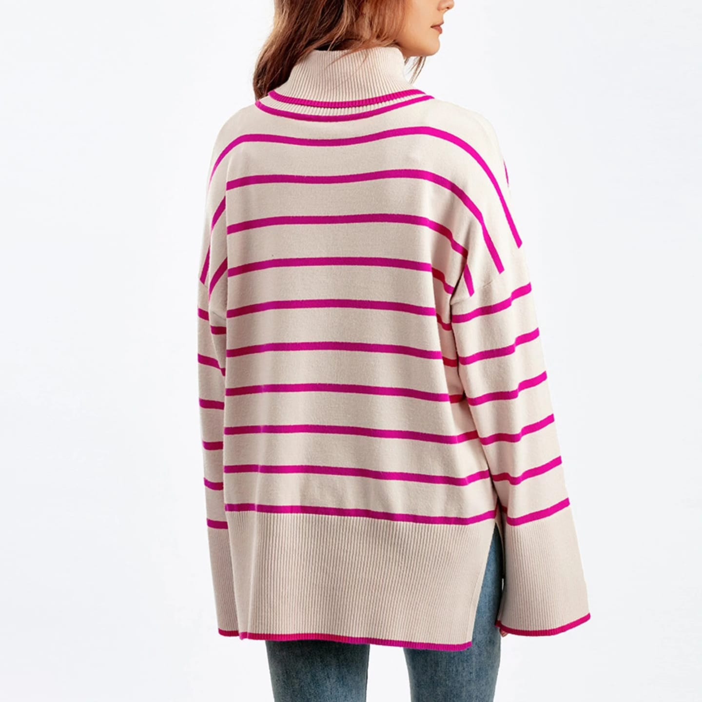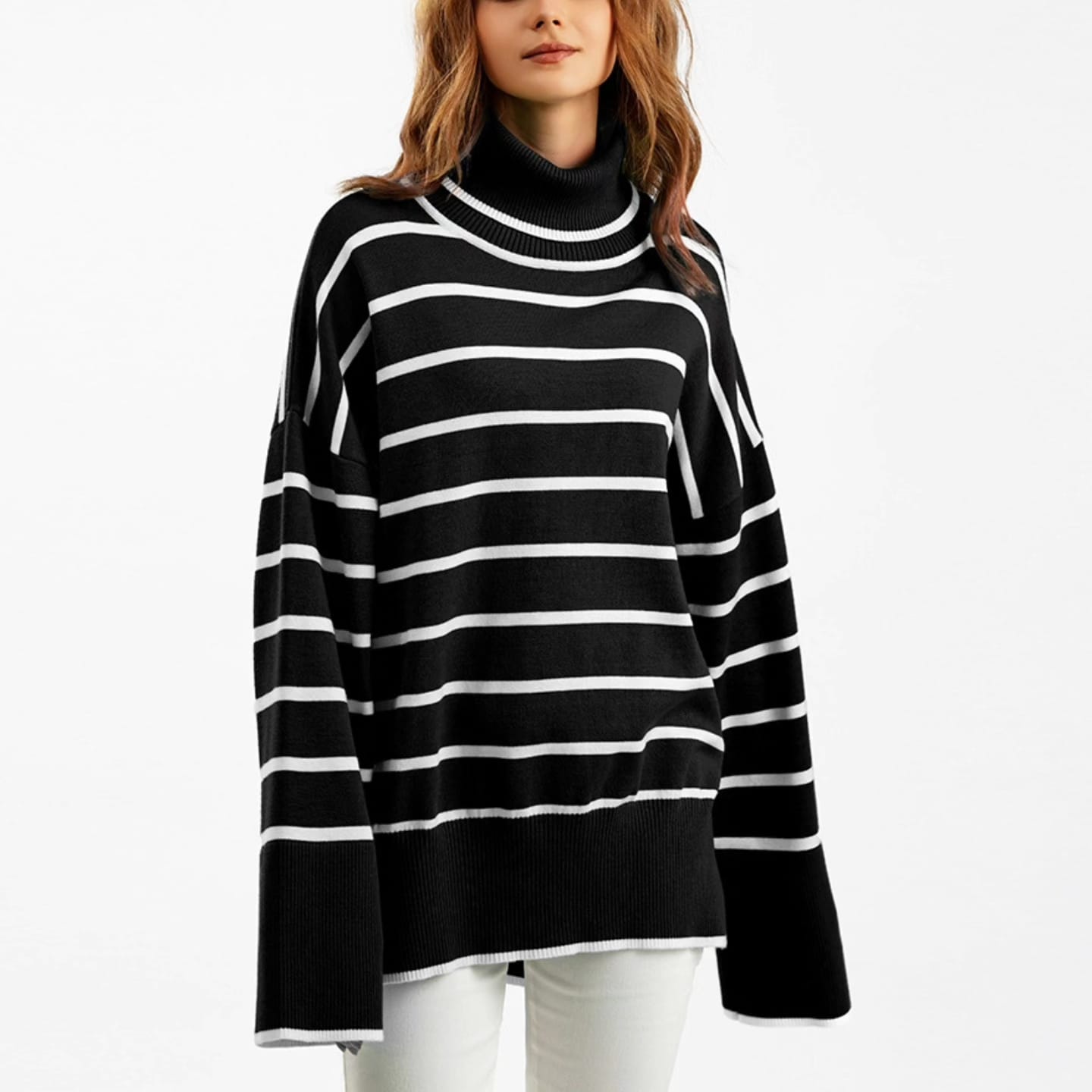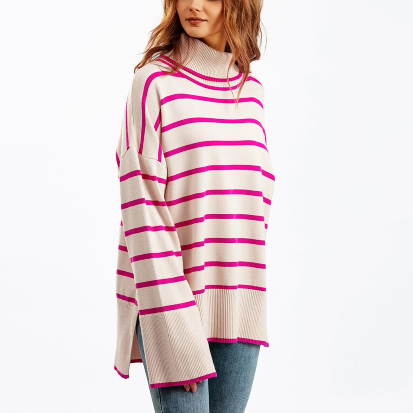 Cozy striped turtleneck knit sweater with side slits for a relaxed and stylish fit.