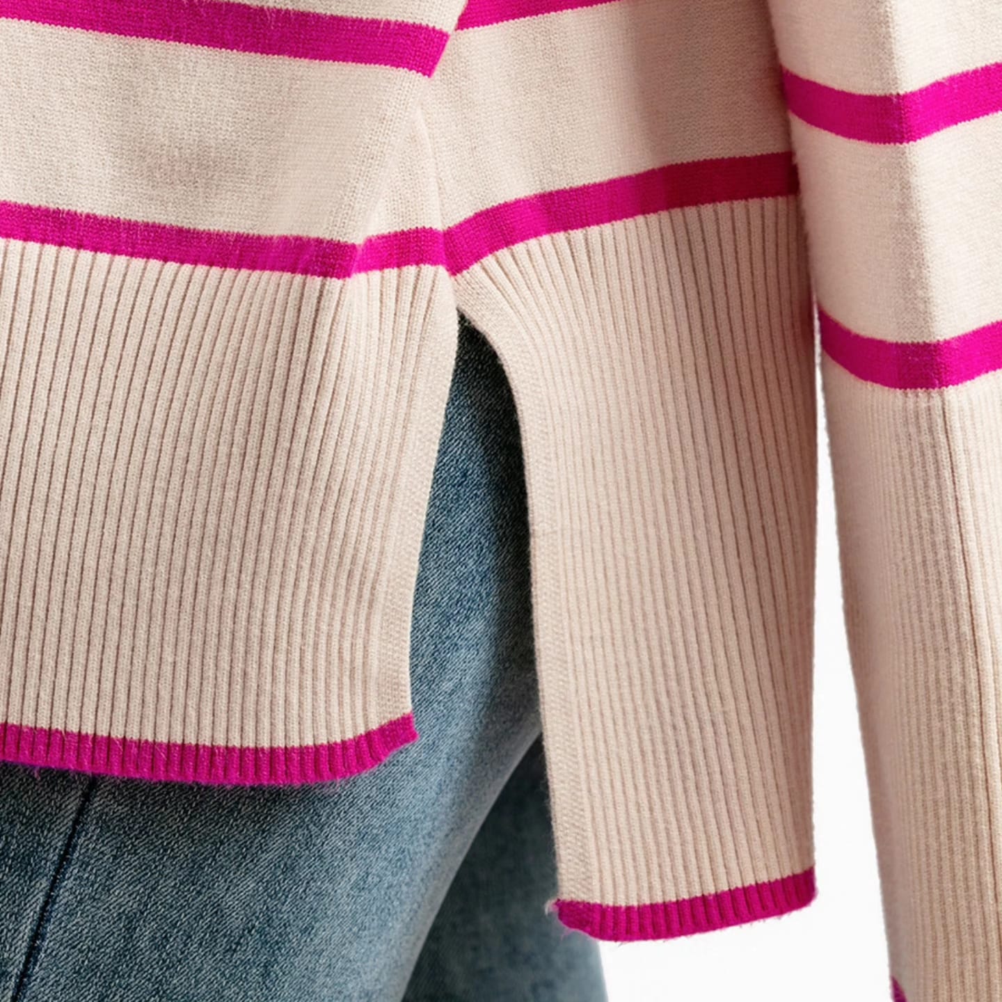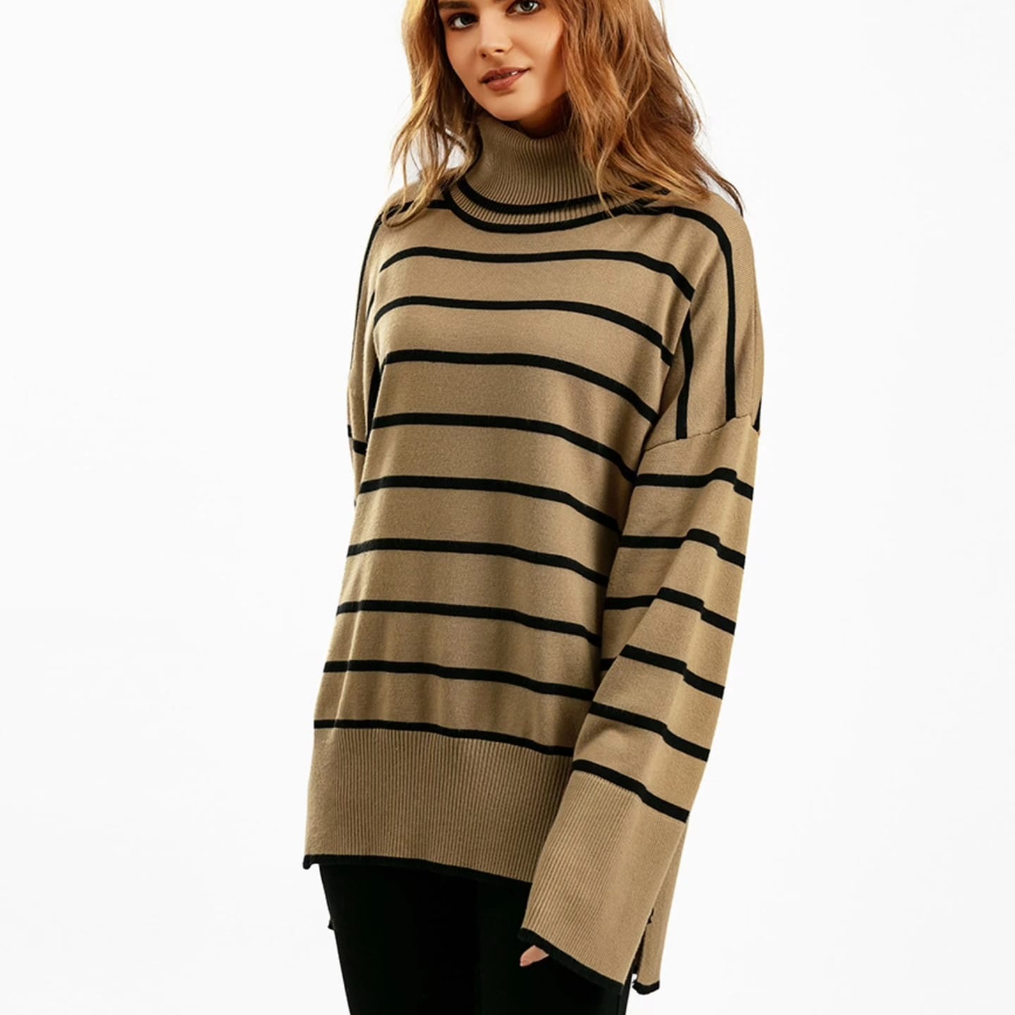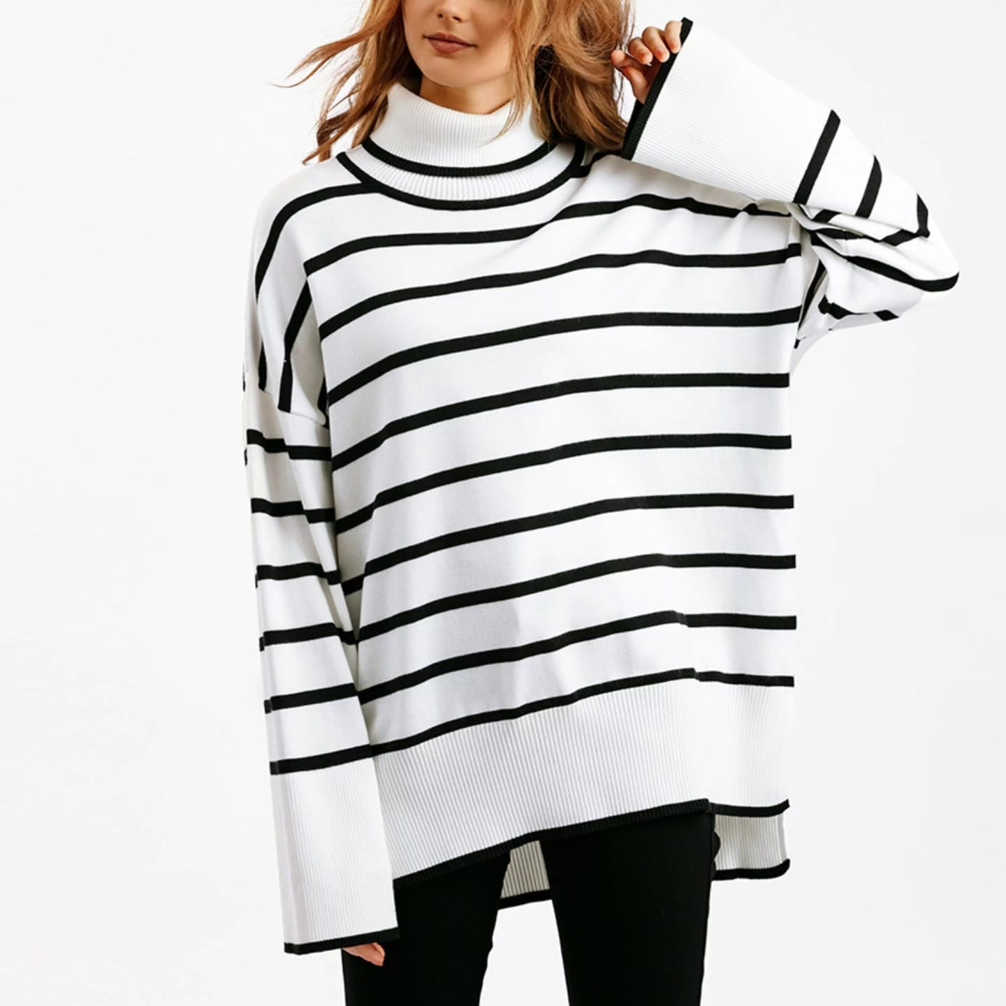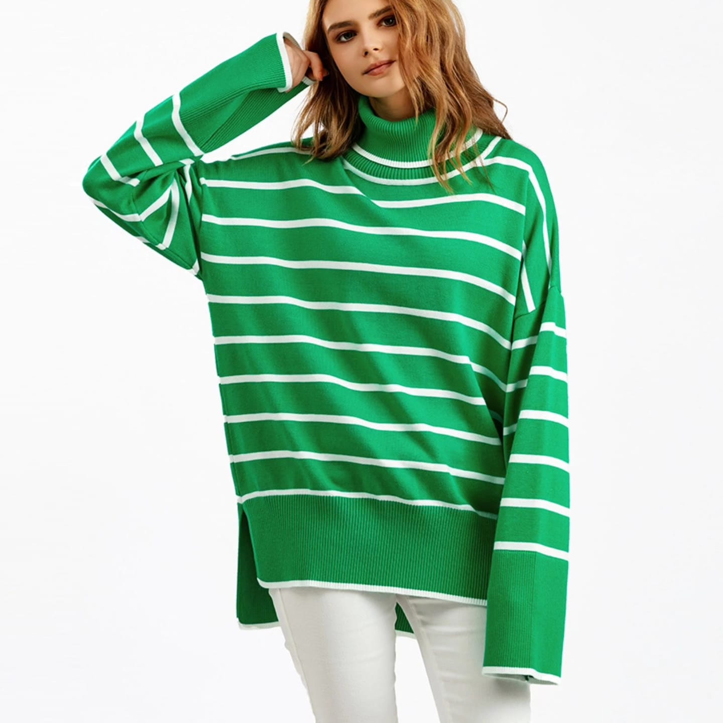 Cozy striped turtleneck knit sweater with side slits for a relaxed and stylish fit.