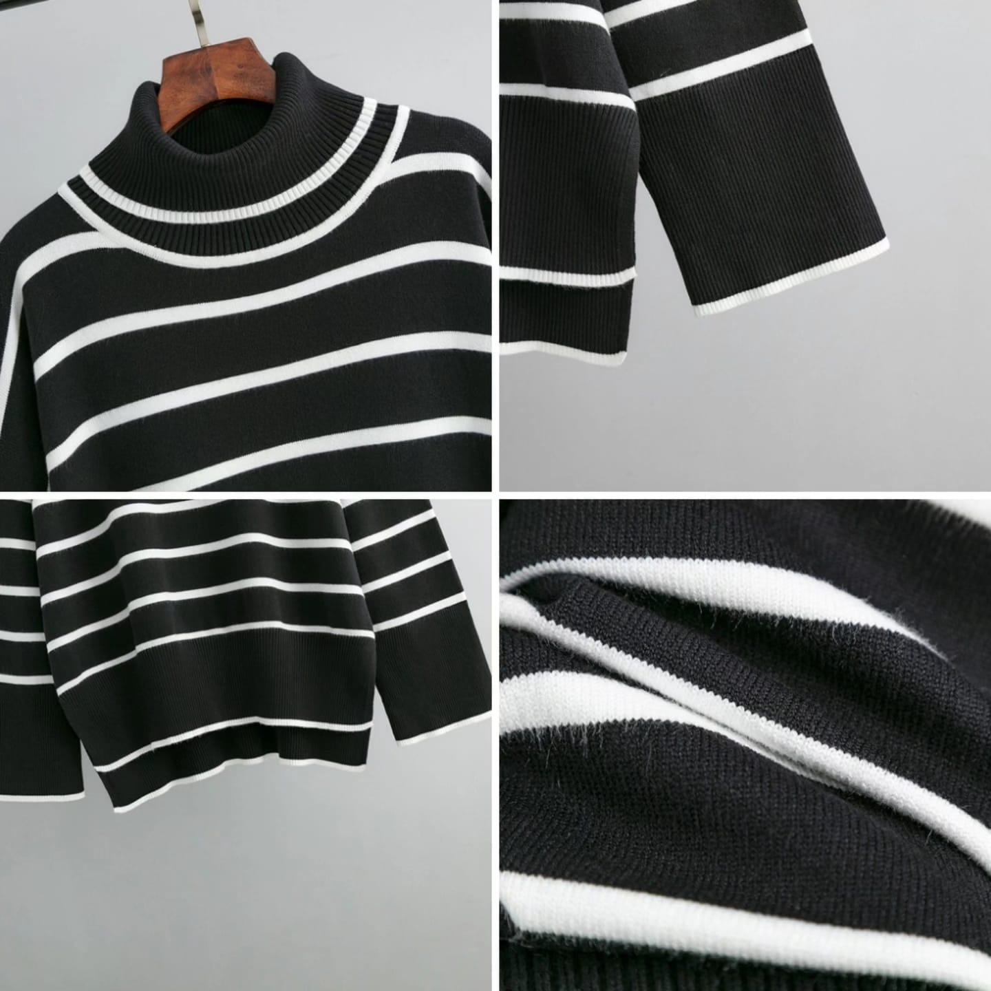 Stay effortlessly chic in this striped turtleneck knit sweater, designed for both warmth and style. Crafted from soft, breathable knit fabric, it features a classic turtleneck for extra comfort and side slits that add movement and a modern twist. The timeless striped pattern makes it easy to pair with jeans, skirts, or tailored pants, making it a versatile addition to your fall and winter wardrobe. Perfect for layering or wearing on its own for a laid-back yet polished look.
