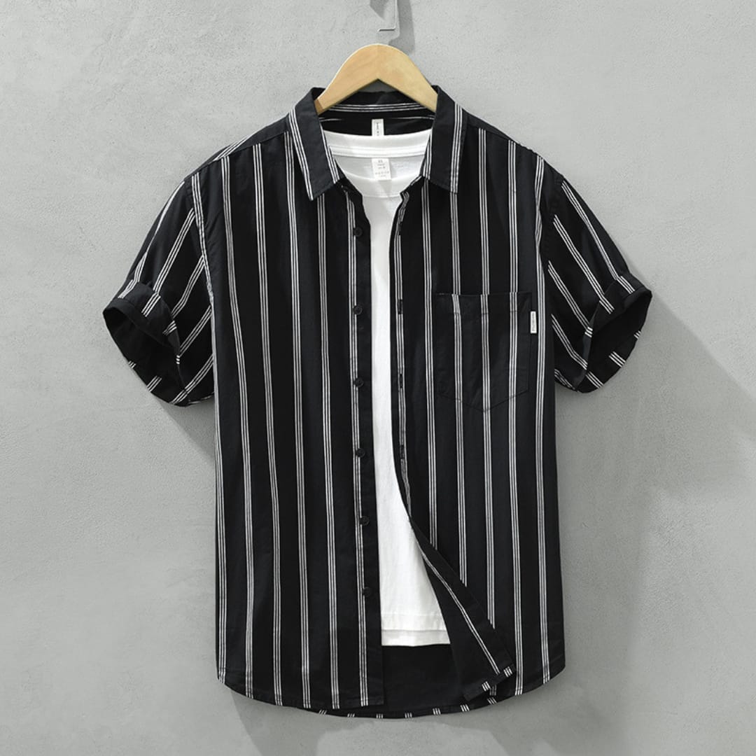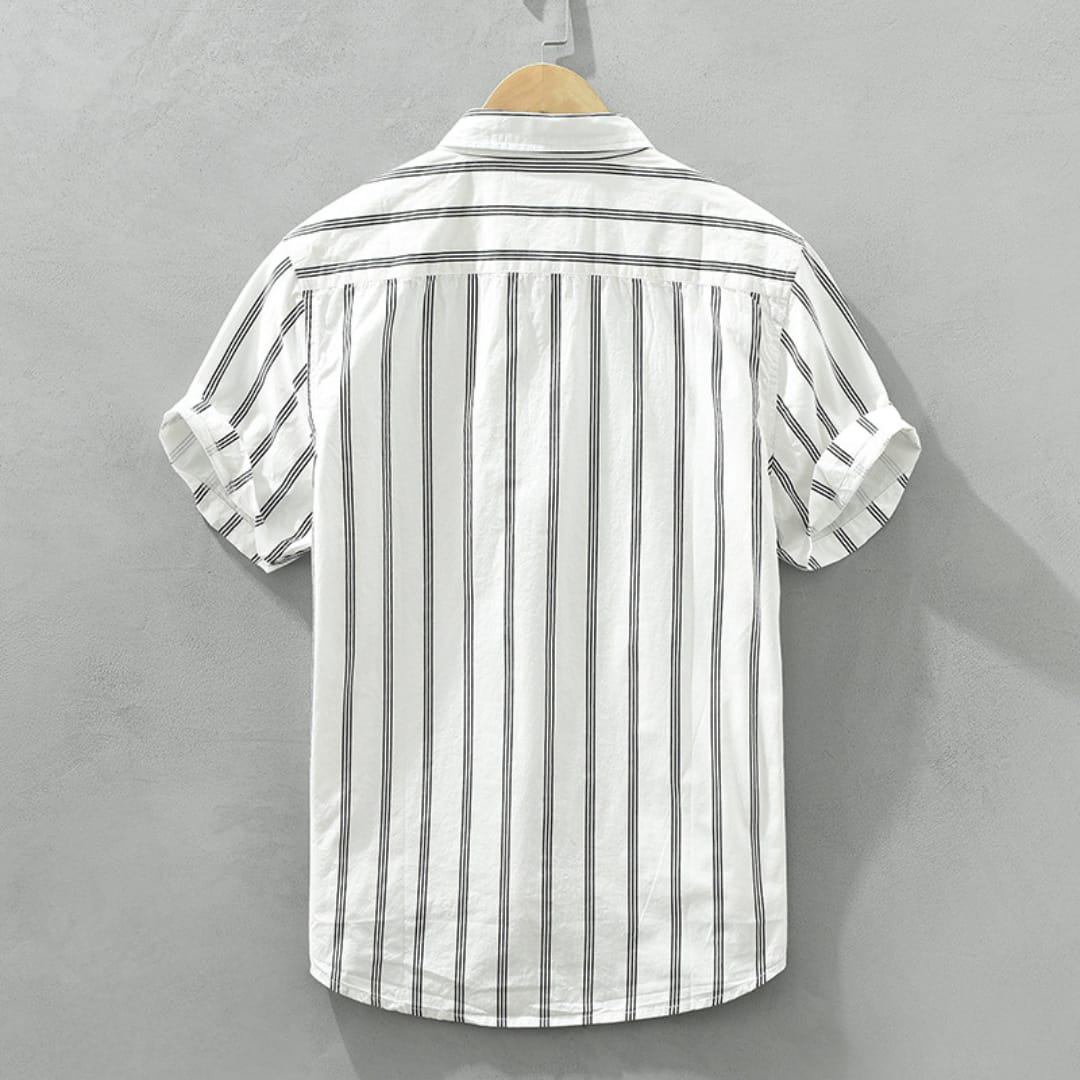 Men’s summer short sleeved striped shirt with breathable fabric, classic fit, and stylish vertical stripesperfect for warm-weather casual wear.