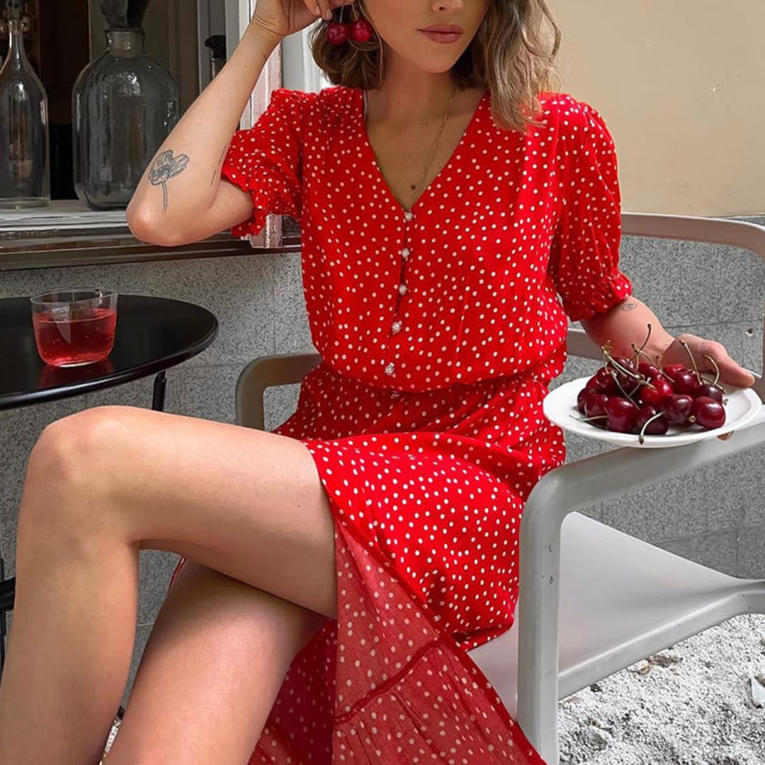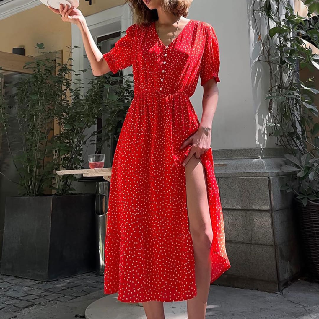 This womens summer dress features a flattering V-neckline and a vibrant red pattern, offering a stylish and eye-catching look. The lightweight, breathable fabric ensures comfort during warm weather, while the side slit adds a touch of elegance and freedom of movement. Ideal for casual outings, beach trips, or summer parties, this versatile dress pairs beautifully with sandals or wedges for a chic and effortless summer style.