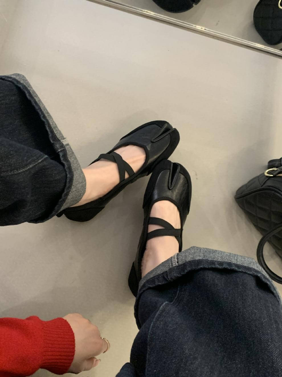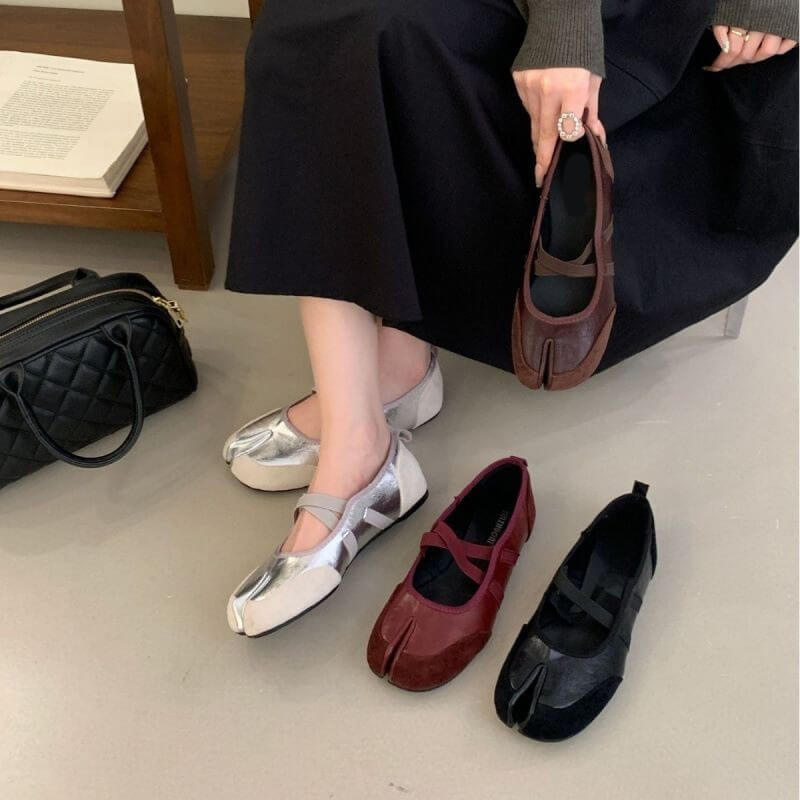 Women Tabi Criss Cross Suede Mary Janes elegant split-toe flats with soft suede finish and chic criss-cross straps for a modern, fashion-forward look.