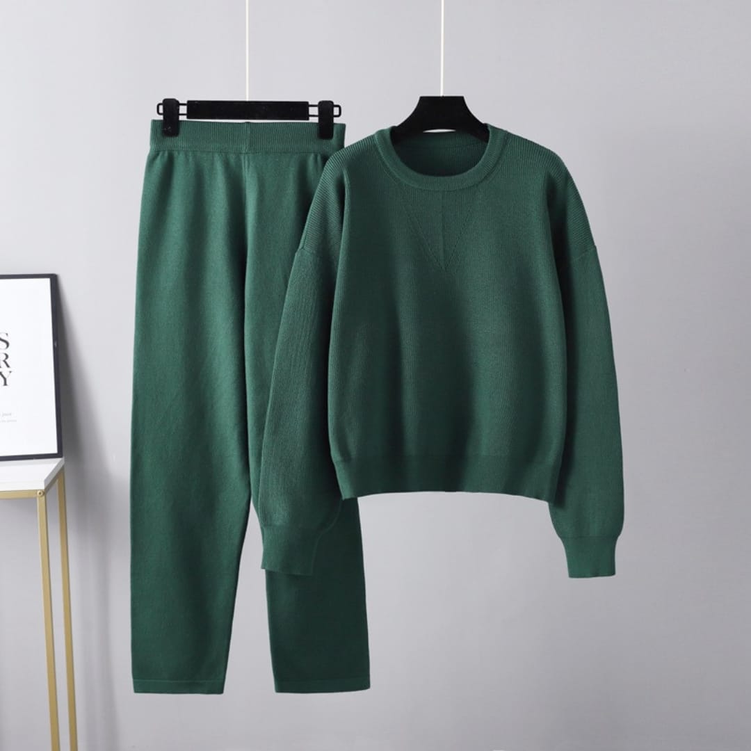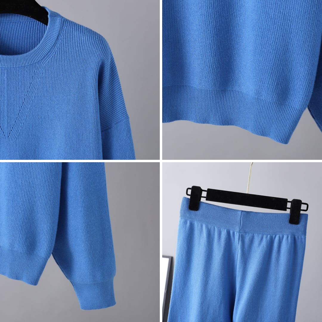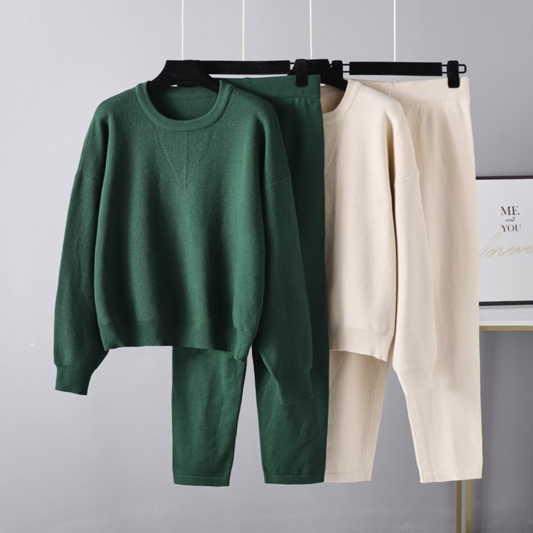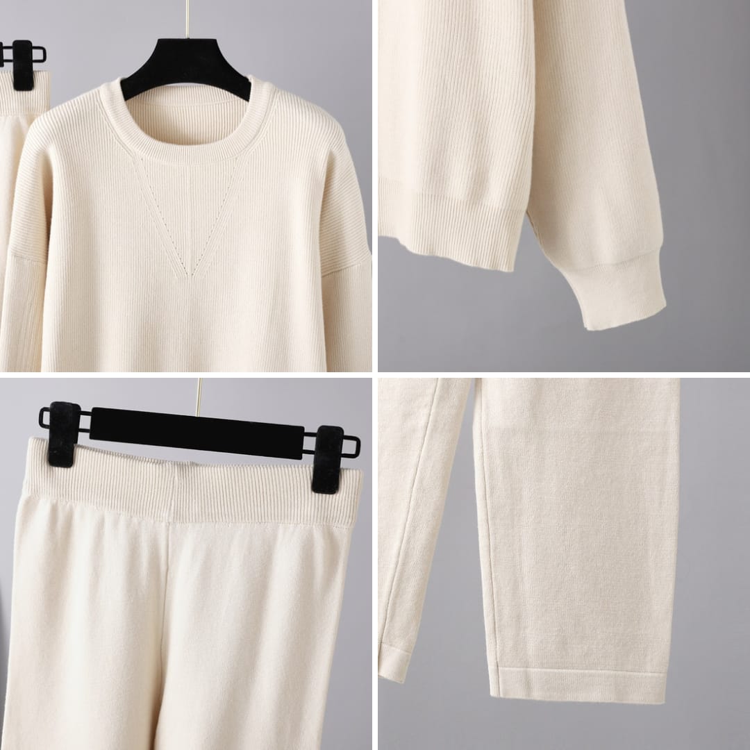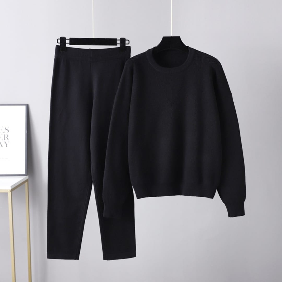 A cozy winter set featuring a thick ribbed sweater and matching high-waisted loose-fit pantscomfort and style in perfect harmony.