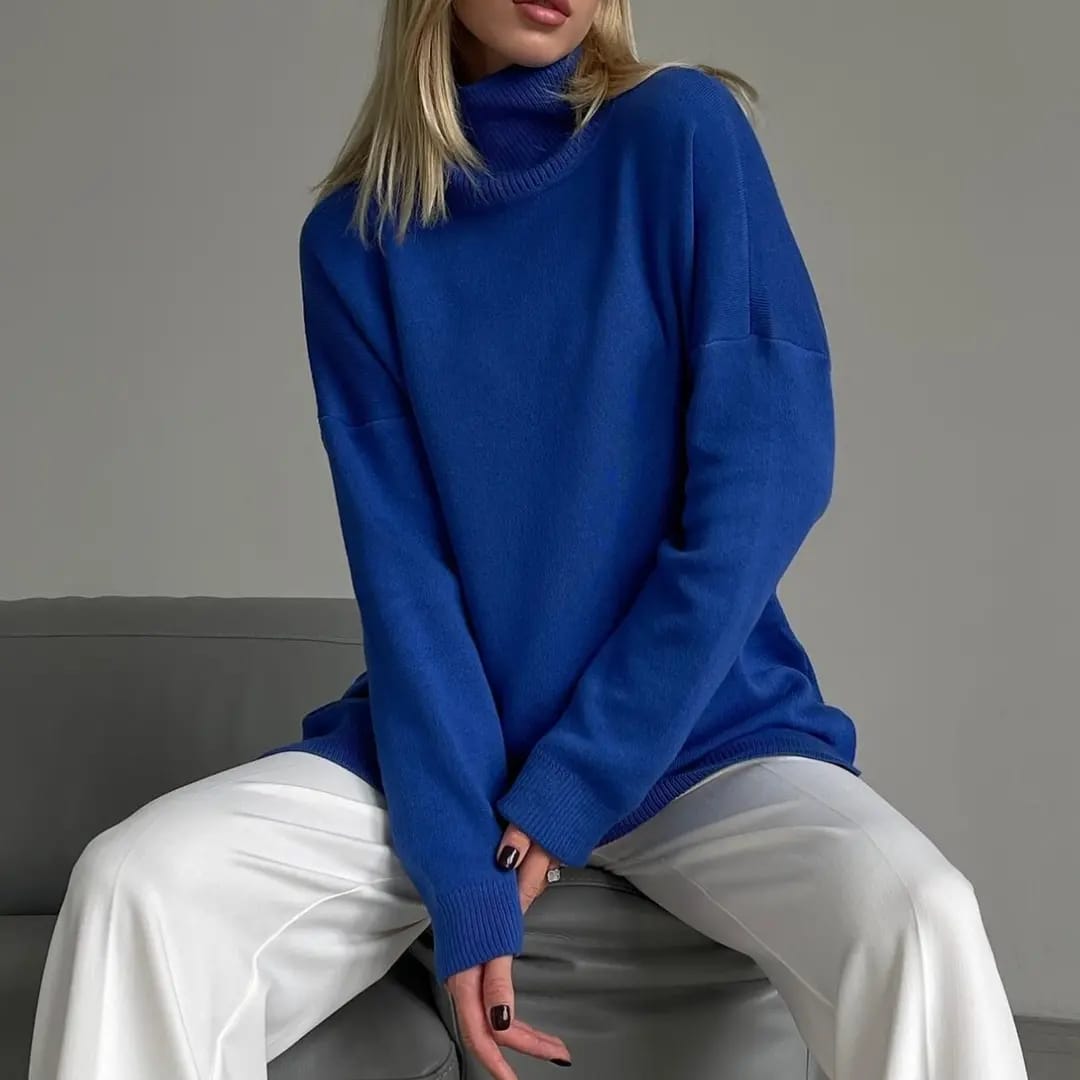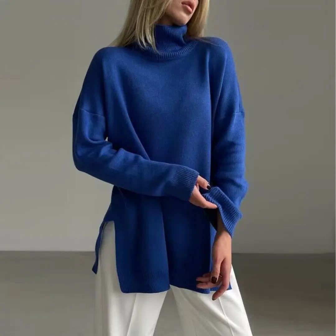 Cozy and stylish, this thick turtleneck sweater with side slits offers warmth with a modern edge.