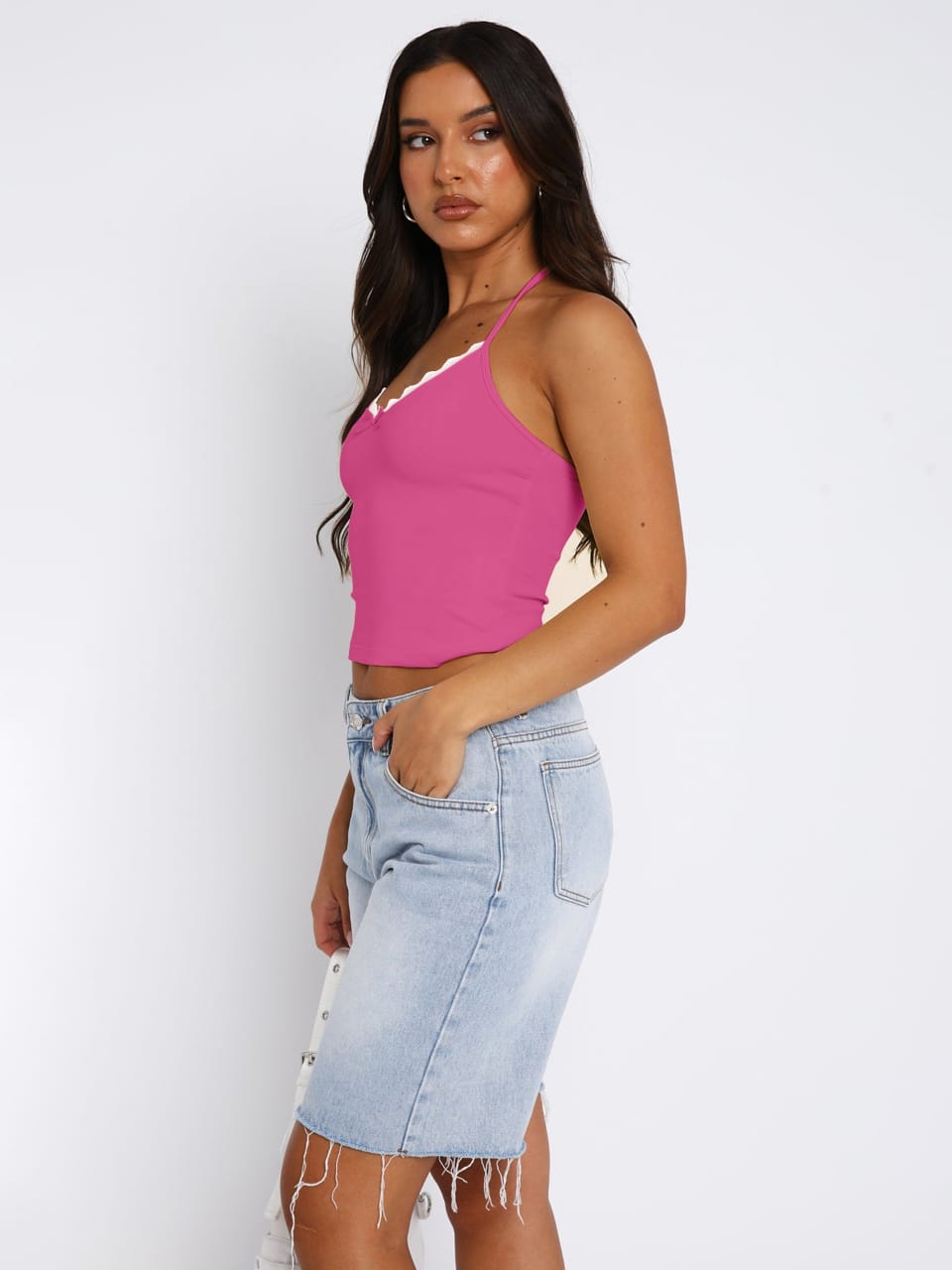 Elevate your wardrobe with this thin-strapped camisole, designed for both comfort and style. Crafted from soft, breathable fabric, it features delicate lace trim that adds a touch of feminine charm. The adjustable straps ensure a customized fit, making it ideal for layering under blazers, cardigans, or worn alone during warmer days. Whether you’re dressing up for a night out or looking for a chic base layer, this camisole blends versatility with timeless appeal. Its lightweight feel and flattering silhouette make it a staple in any modern closet. Pair with jeans, skirts, or loungewear for effortless elegance.