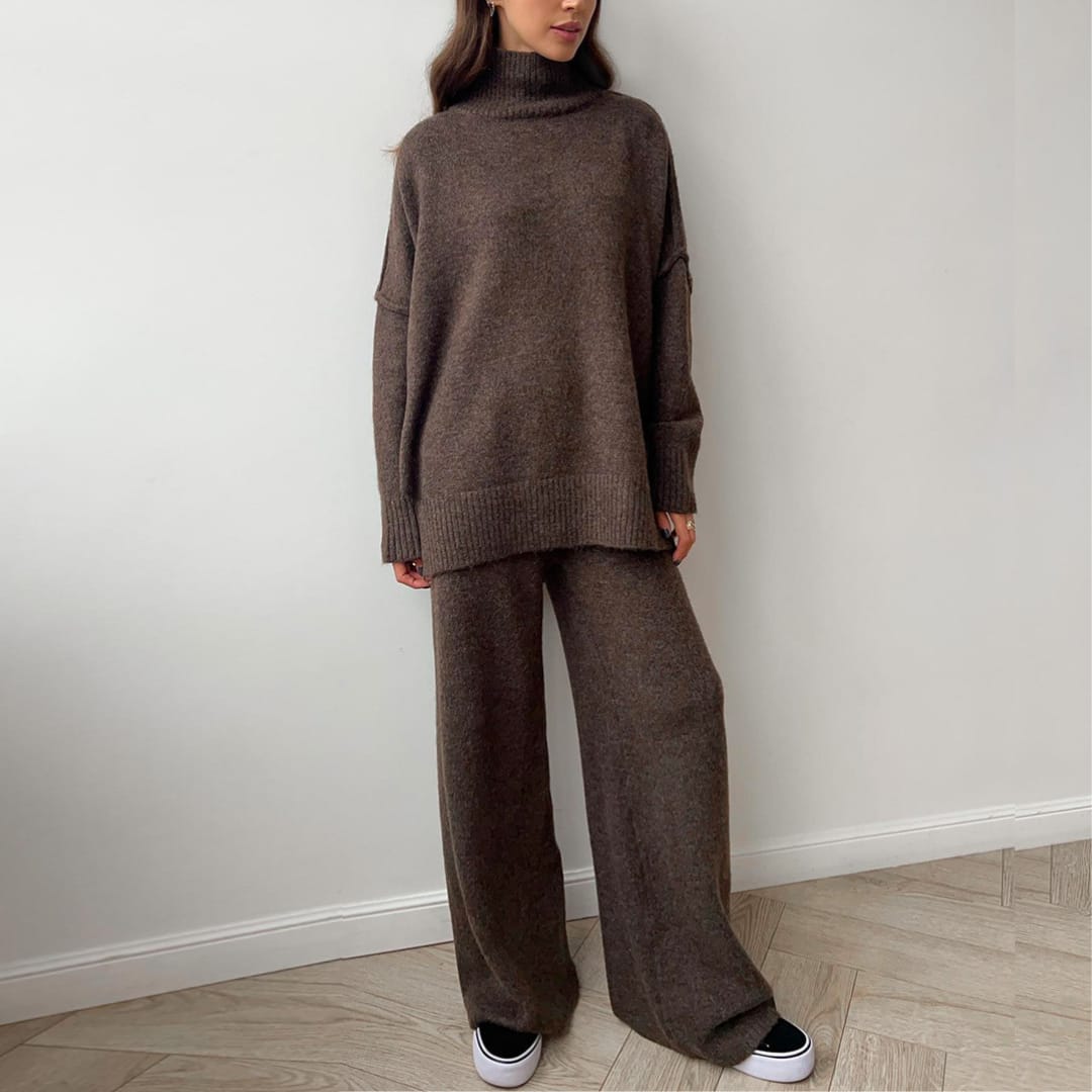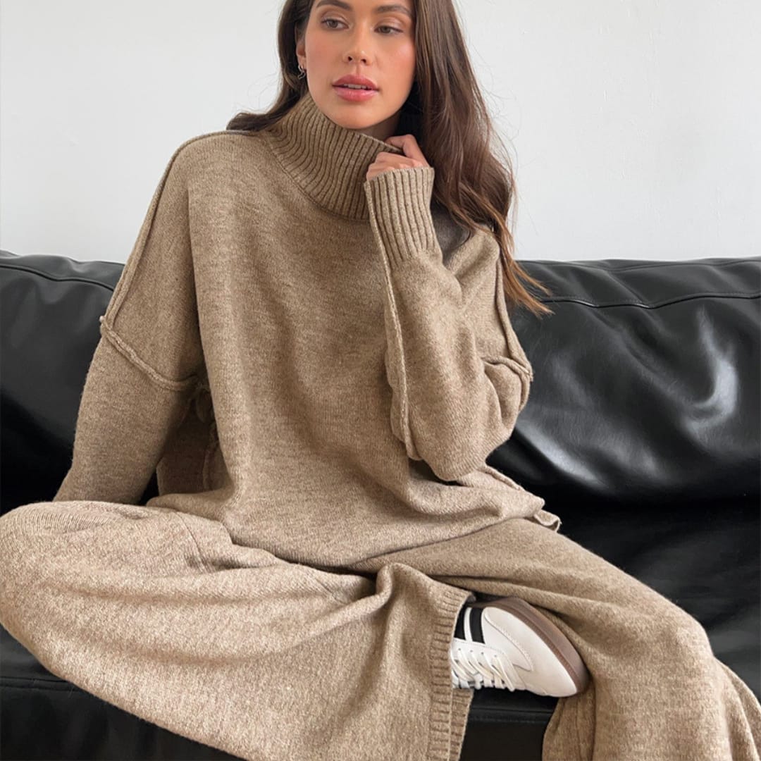 This Womens Heavyweight Autumn and Winter Knitted Set blends luxurious comfort with modern sophistication. Designed with a thick, premium knit, the set includes a loose-fit turtleneck sweater and matching wide-leg pants that deliver both warmth and effortless style. The heavyweight fabric ensures durability and insulation for colder days, while the relaxed silhouette offers unrestricted comfort and an elegant drape. Perfect for lounging, travel, or casual outings, this matching set brings refined minimalism to your fall and winter wardrobe. Pair it with boots or sneakers for a chic, cozy ensemble that redefines cold-weather fashion.
