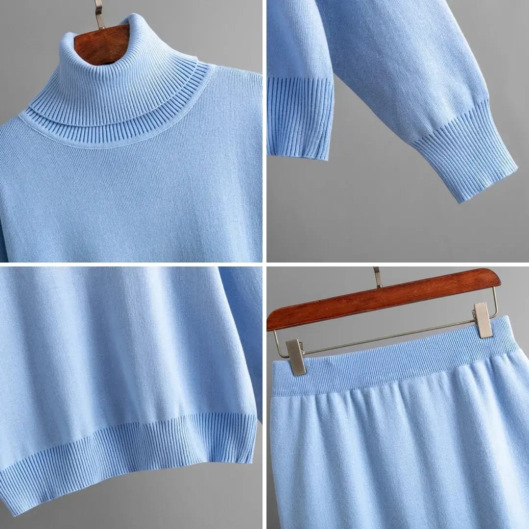 Cozy and chic, this women’s turtleneck sweater paired with a matching skirt offers a stylish and comfortable outfit for cooler days.