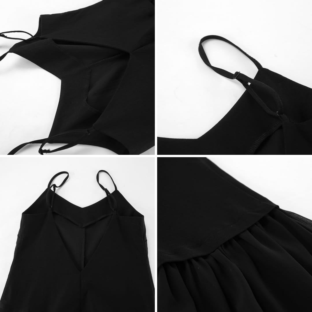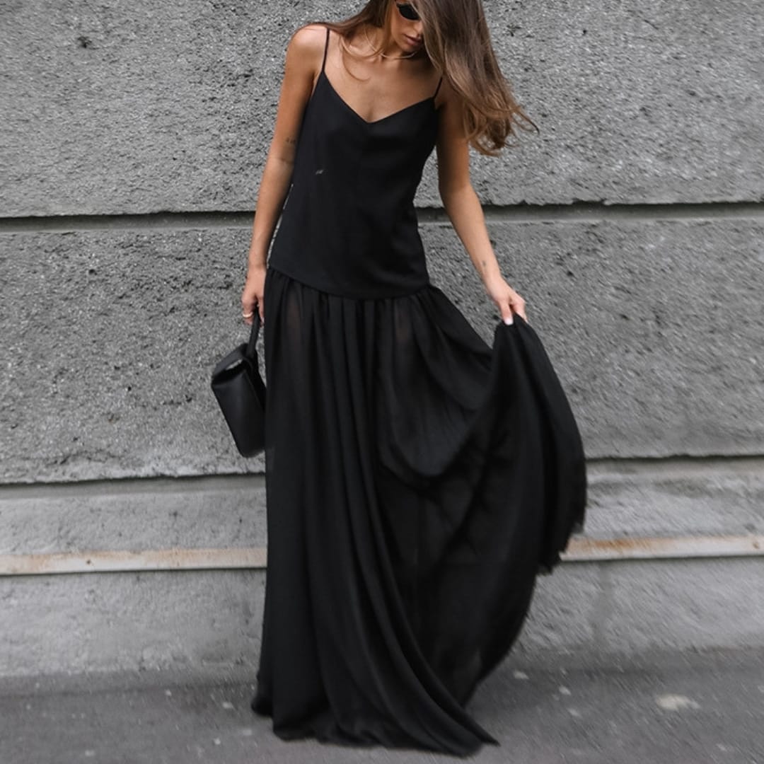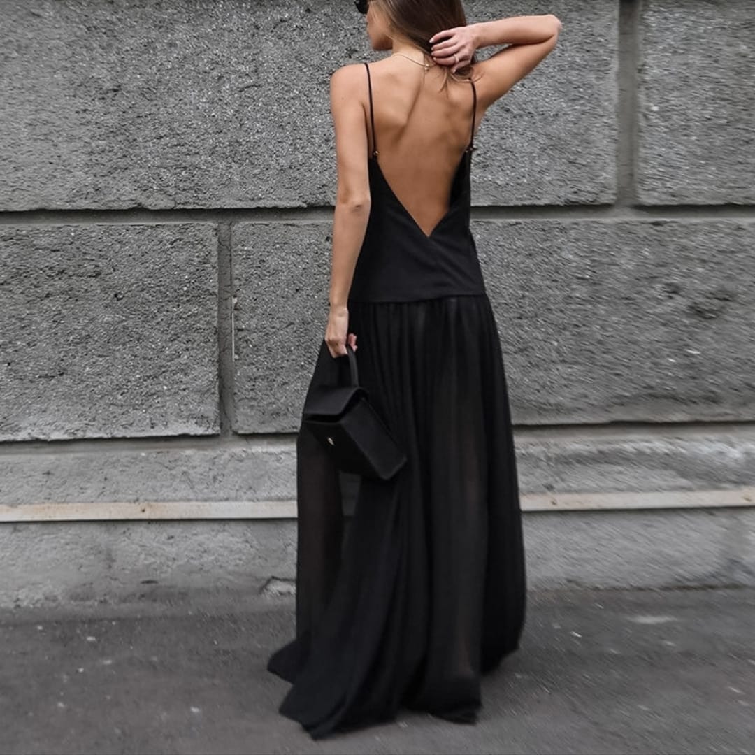 Elegant V-neck backless suspender dress with a sleek, flattering silhouette.