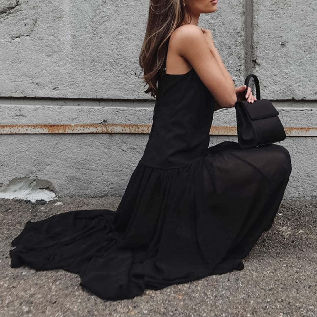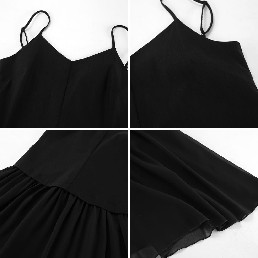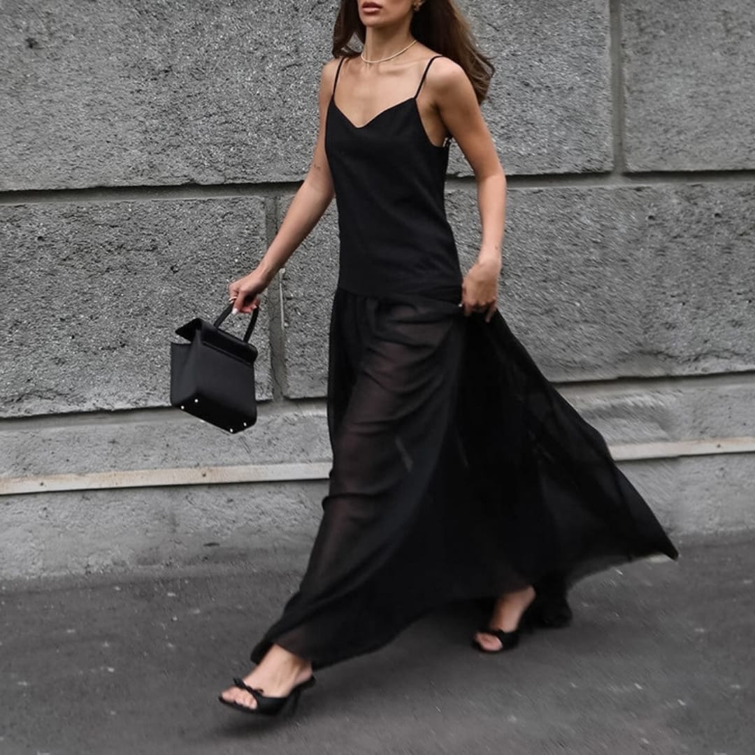 Elegant V-neck backless suspender dress with a sleek, flattering silhouette.