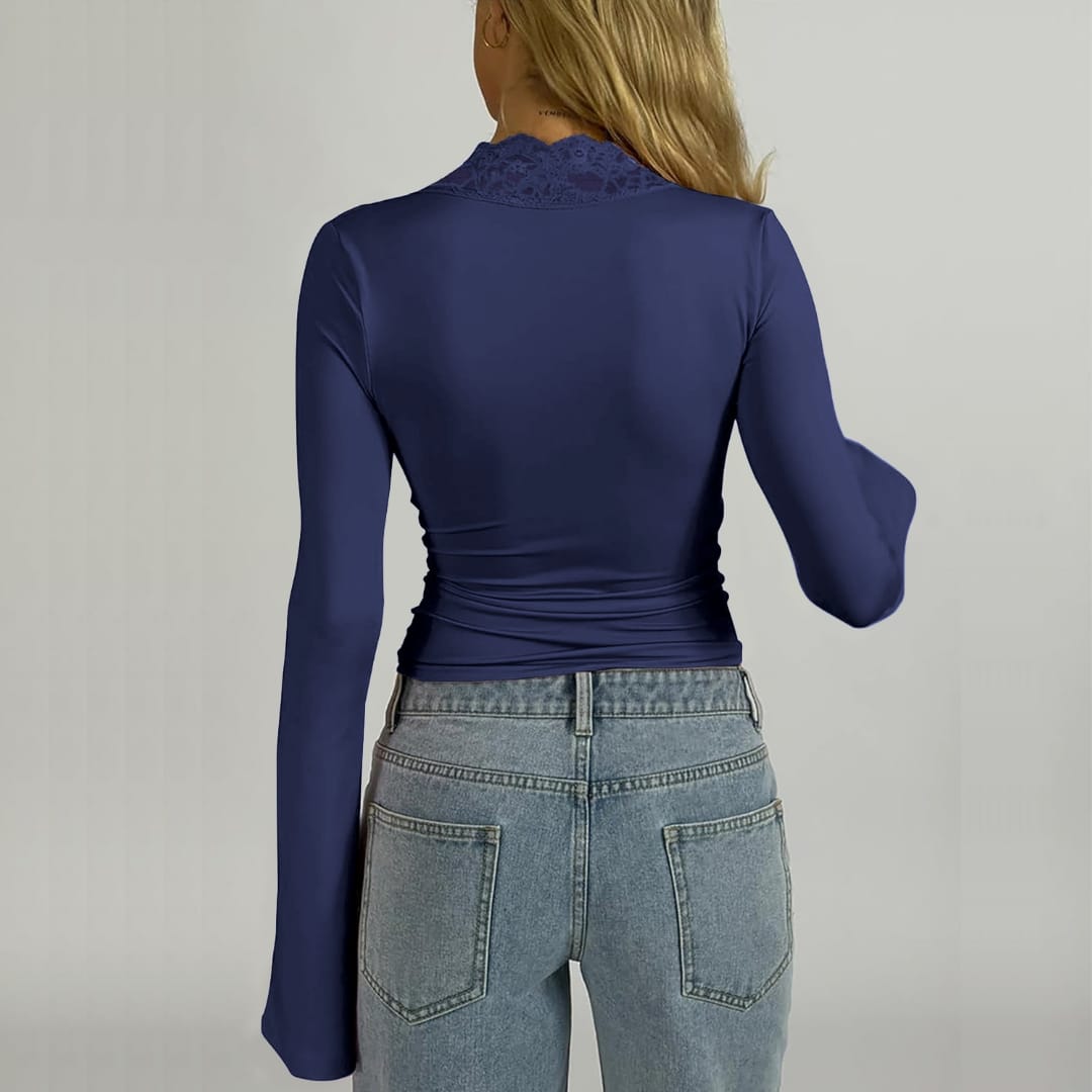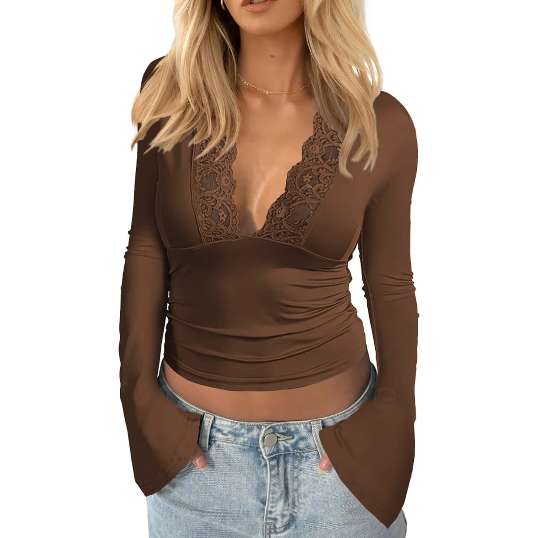 Add a touch of elegance with our Womens V-Neck Lace Flared Long Sleeve Top soft, feminine, and perfect for spring, autumn, and winter style.